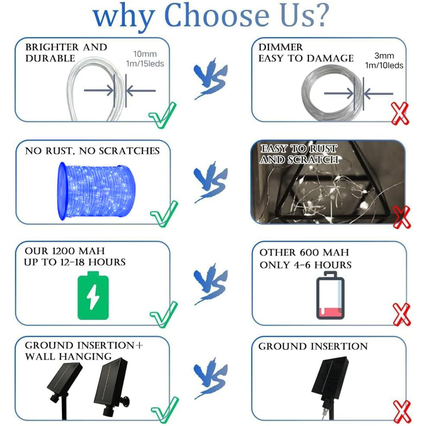 ?Solar String Lights Moldable Shape?66 Feet Long Silver Wire Outdoor Tube Light String, With 200 Low-Heat Led Lights, Energy Saving And Environmental Protection; With Steady 360 Degree Viewing Angle They Illuminate In Every Direction. The Super Flexible Is Easy To Mold Into Any Shape That You Desire, Rope Light Can Be Wrapped Around Trees, Balconies, Furniture, Windows, Stairs, Etc.
