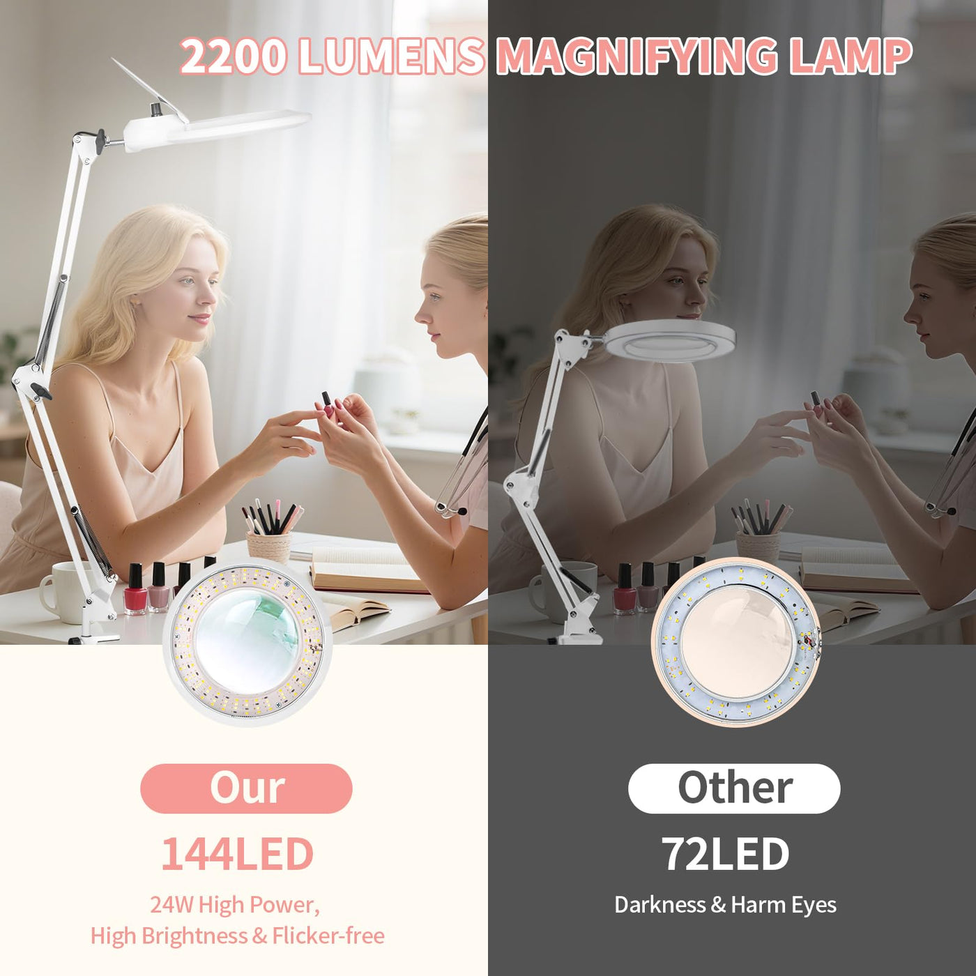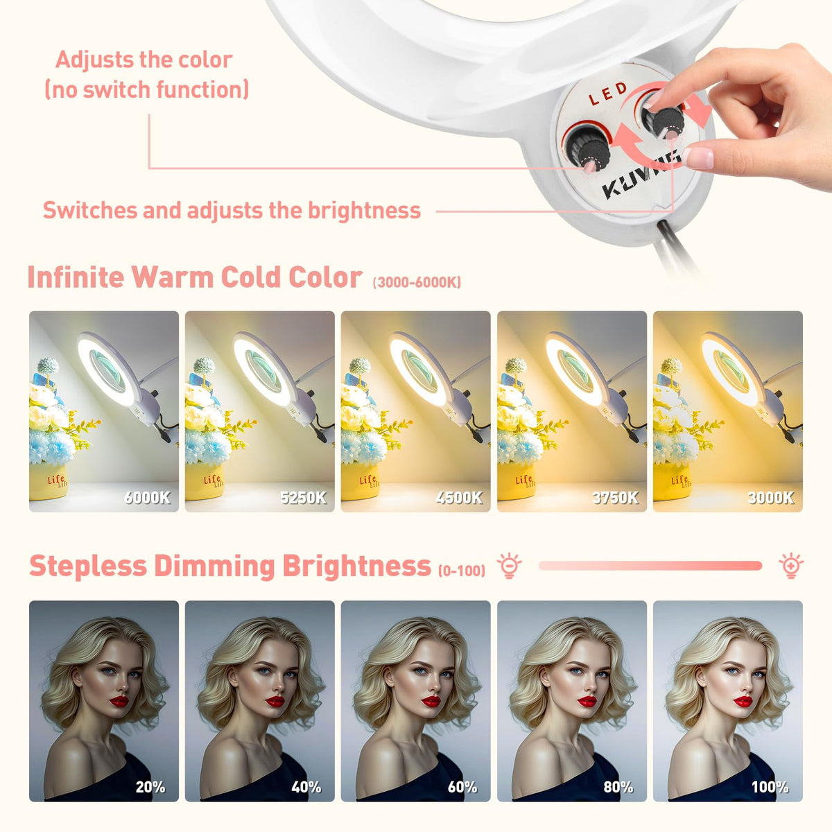 KUVRS 10X Magnifying Floor Lamp, 5 Wheel Rolling Base Esthetician Light, 2200 Lumens Infinite Warm & Cold Dimming LED Lighted Magnifier Glass, Mag Lamp for Needlepoint Tattoo Crafts Facial Sewing