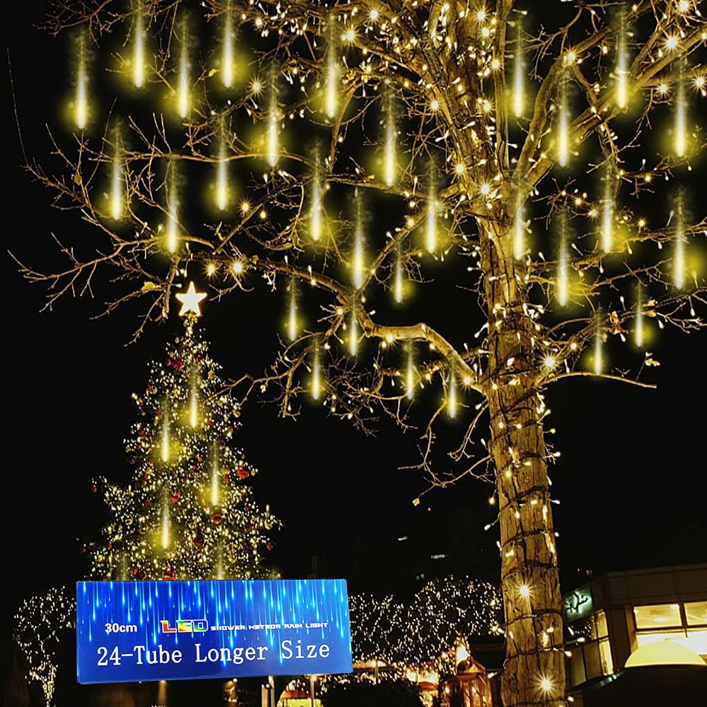 Kwaiffeo Warm White Christmas Lights Outdoor, 24 Tubes(Equivalent To 3 Sets Of 8-Tube) Led Meteor Shower Lights For Xmas Wedding Party Decorations, Warm White Fairy Icicle Lights For Yard Outside