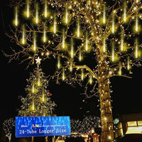 Q: What is the decorative range of these lights?A: The total length of the 24-tube meteor shower lights is 30 feet, making them suitable for decorating items like eaves, patios, or trees. For a Christmas tree, they are ideal for trees ranging from 7 to 9 feet tall, providing flexibility in your holiday decor.