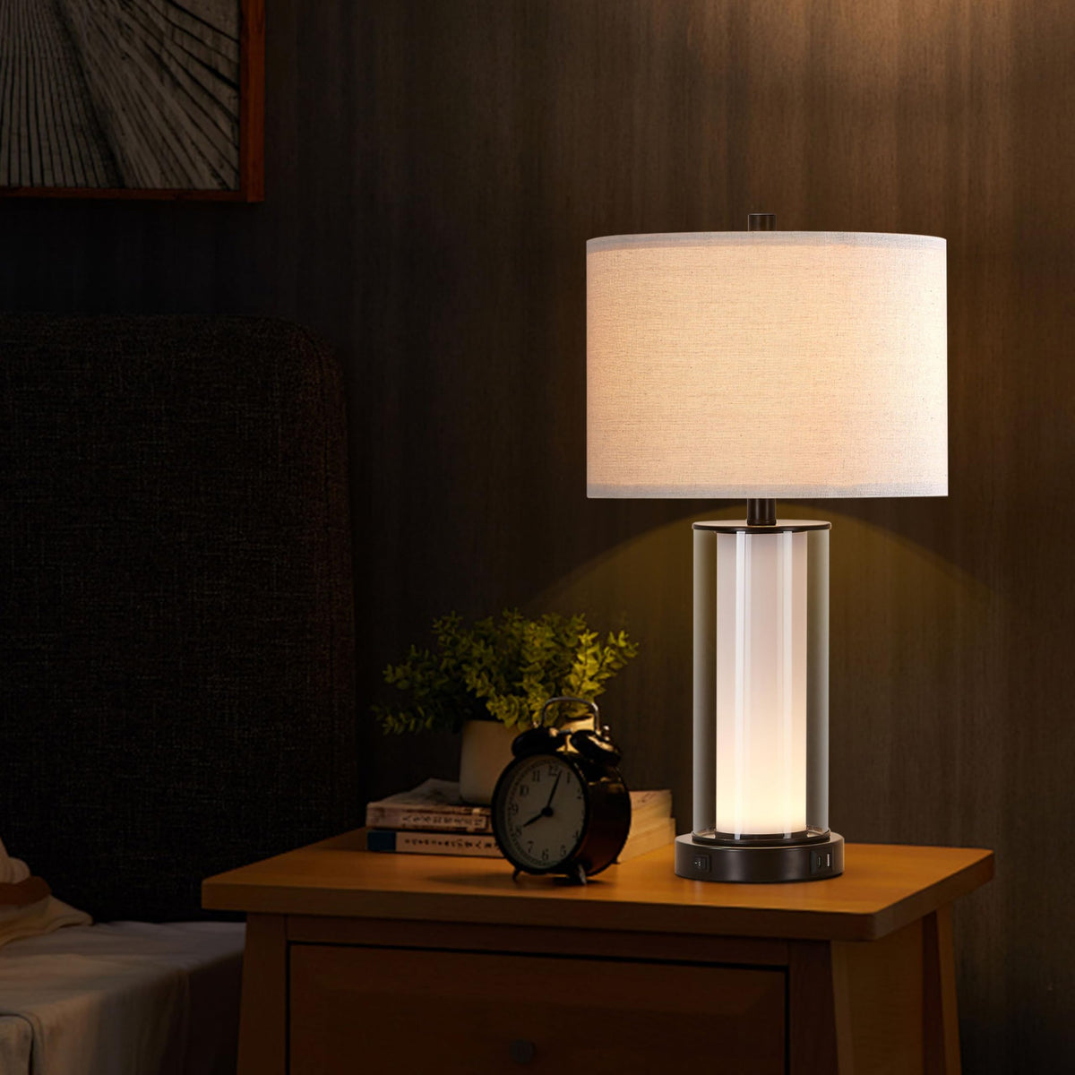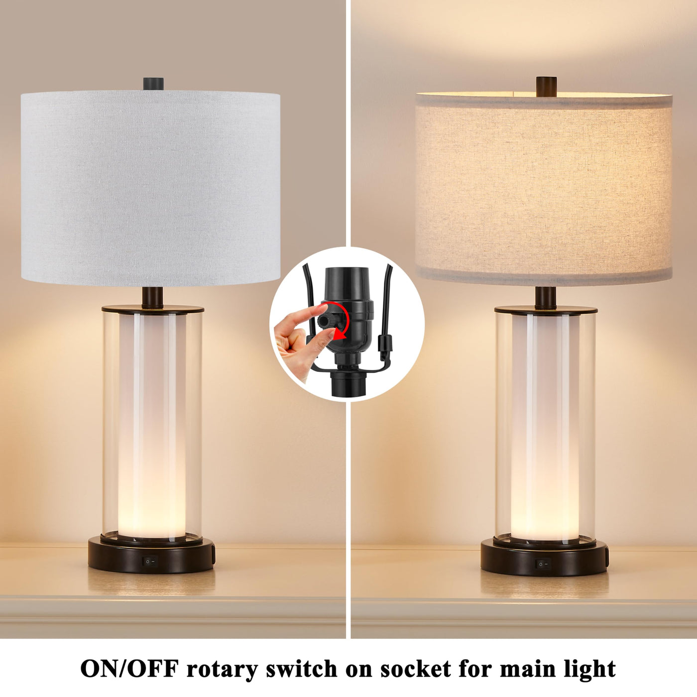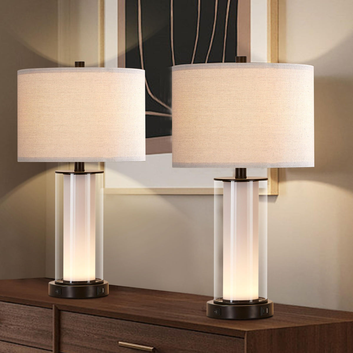 Sleek Cylinder Glass Base With Night Light In An Acrylic Inner Tube Lends This Table Lamp Set A Transparent Beauty. The Center Of The Glass Cylinder Is Encapsulated With An Acrylic Inner Tube That Hides The Power Cord, Maintaining A Clean And Sophisticated Look. The Main Light Is Controlled By The Rotary Switch On The Socket While The Led Night Light Is Controlled By The Rocker Switch On The Front Base. Enjoy The Added Convenience Of Built-In Ac Outlets And Usb Ports. Two 10W Led Bulbs Are Included.