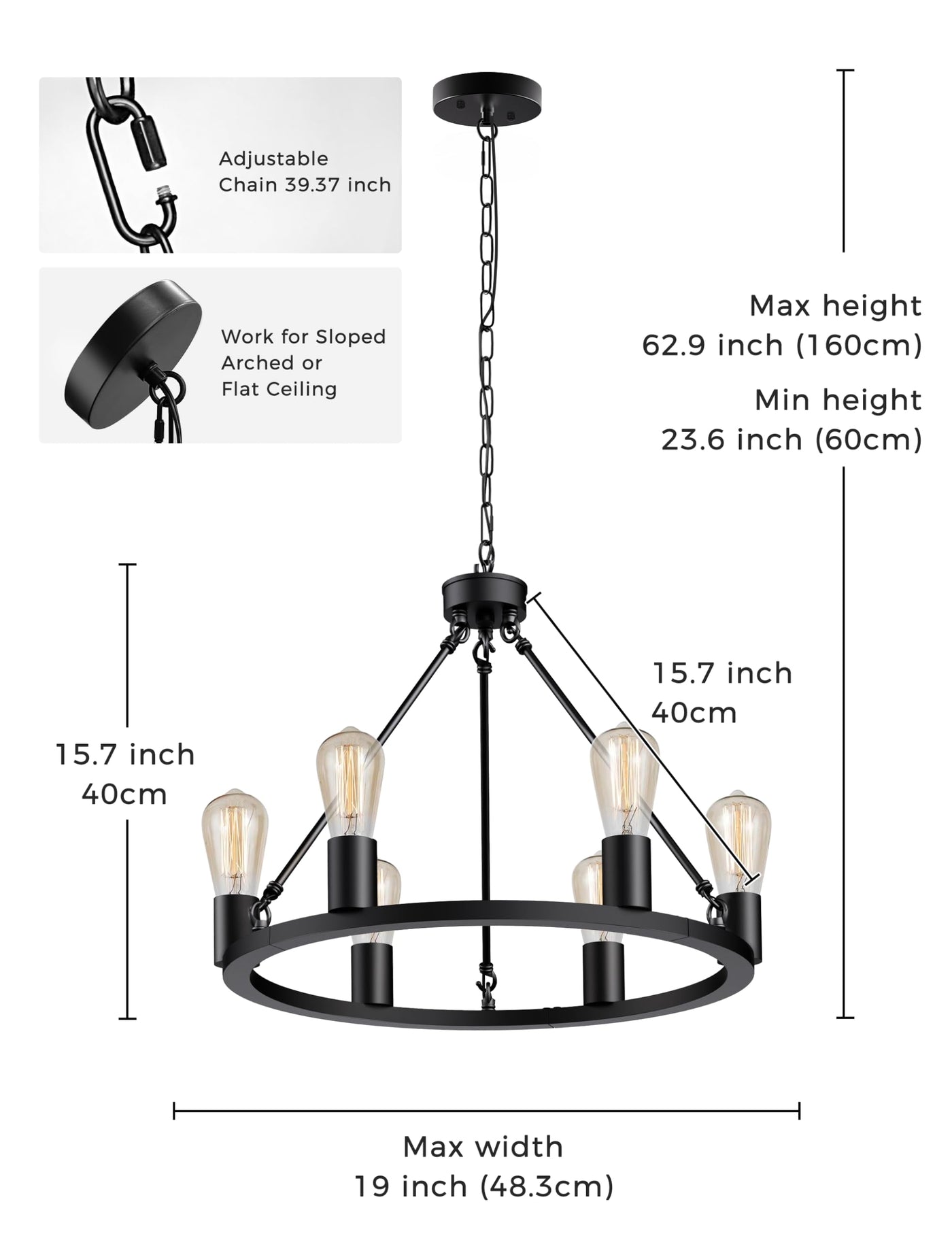 The L LOHAS LED black farmhouse chandelier features a stylish wagon wheel design in durable gold metal, perfect for adding a warm, romantic touch to any room. With a 59 adjustable chain, you can customize the hanging height. It accommodates six E26 bulbs (max 60W each) and is fully dimmable with a compatible dimmer switch. Easy to install and low-maintenance, this versatile chandelier suits various interiors and is available in both gold and black finishes. (Bulbs and dimmer switch not included.)