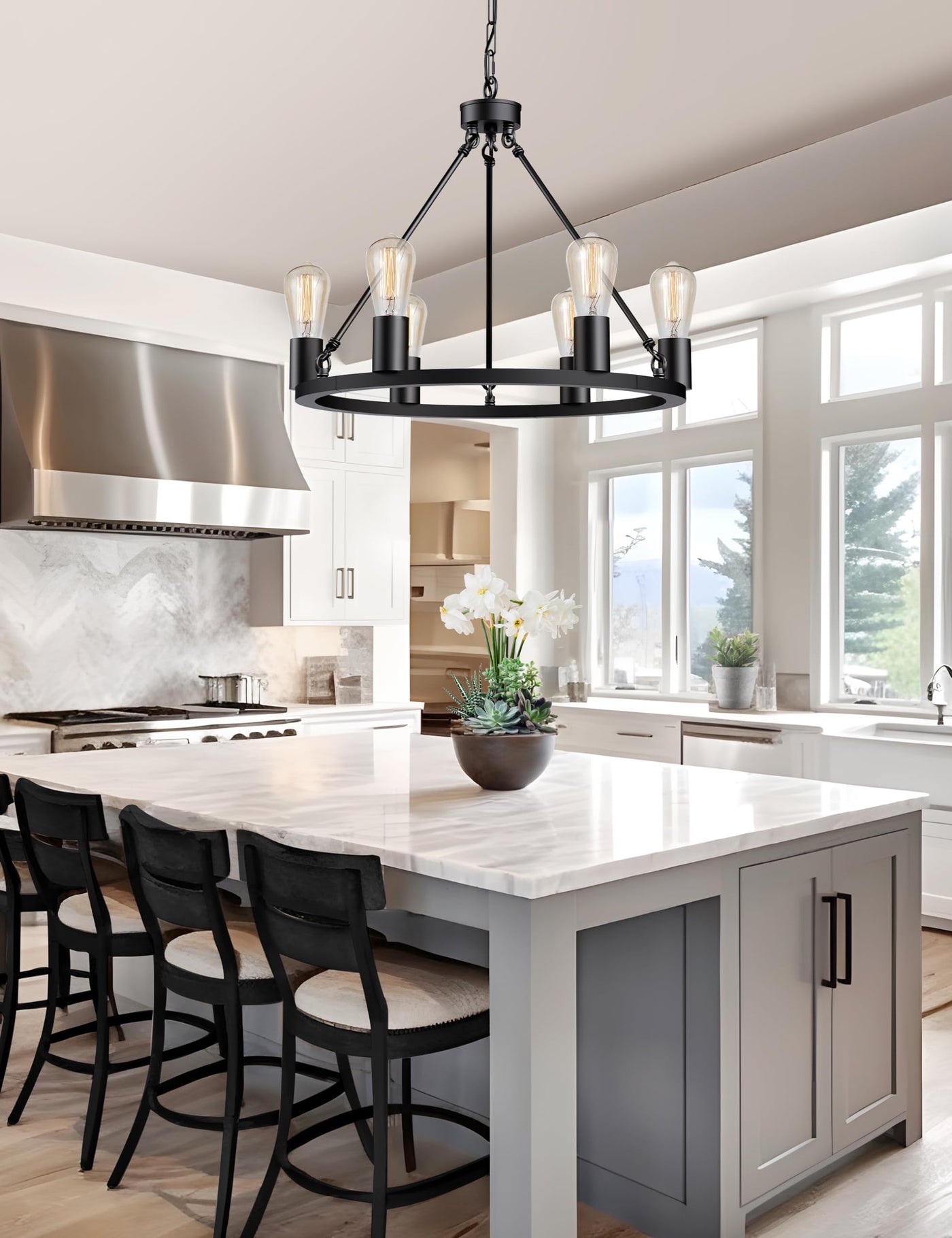 L Lohas Led Black Farmhouse Chandeliers For Dining Room, 6-Light Wagon Wheel Chandelier Over Table, Height Adjustable, 19'' Dini