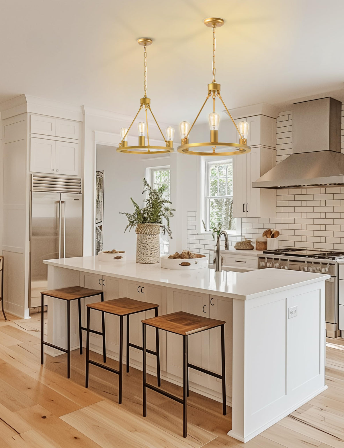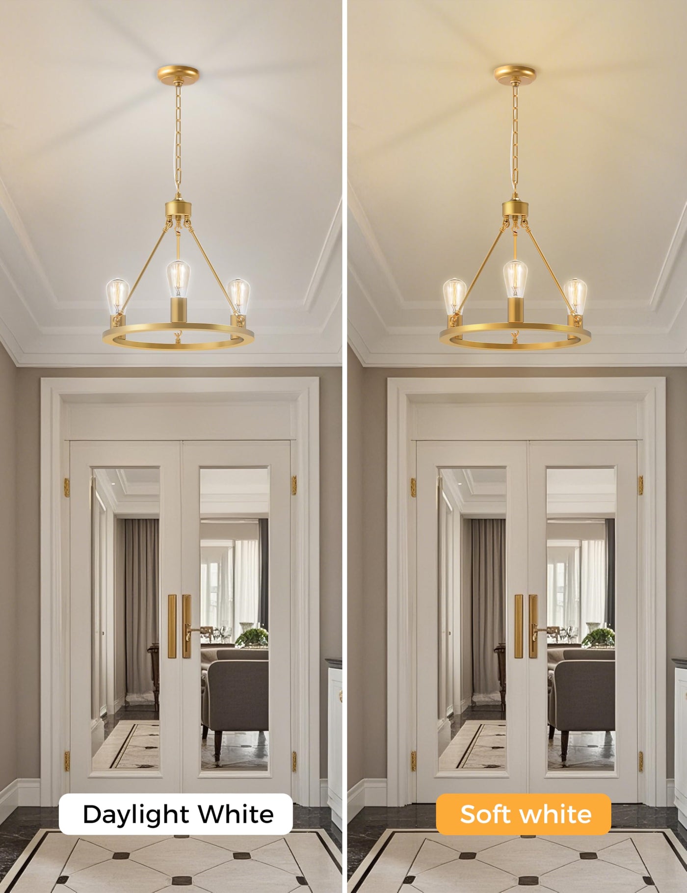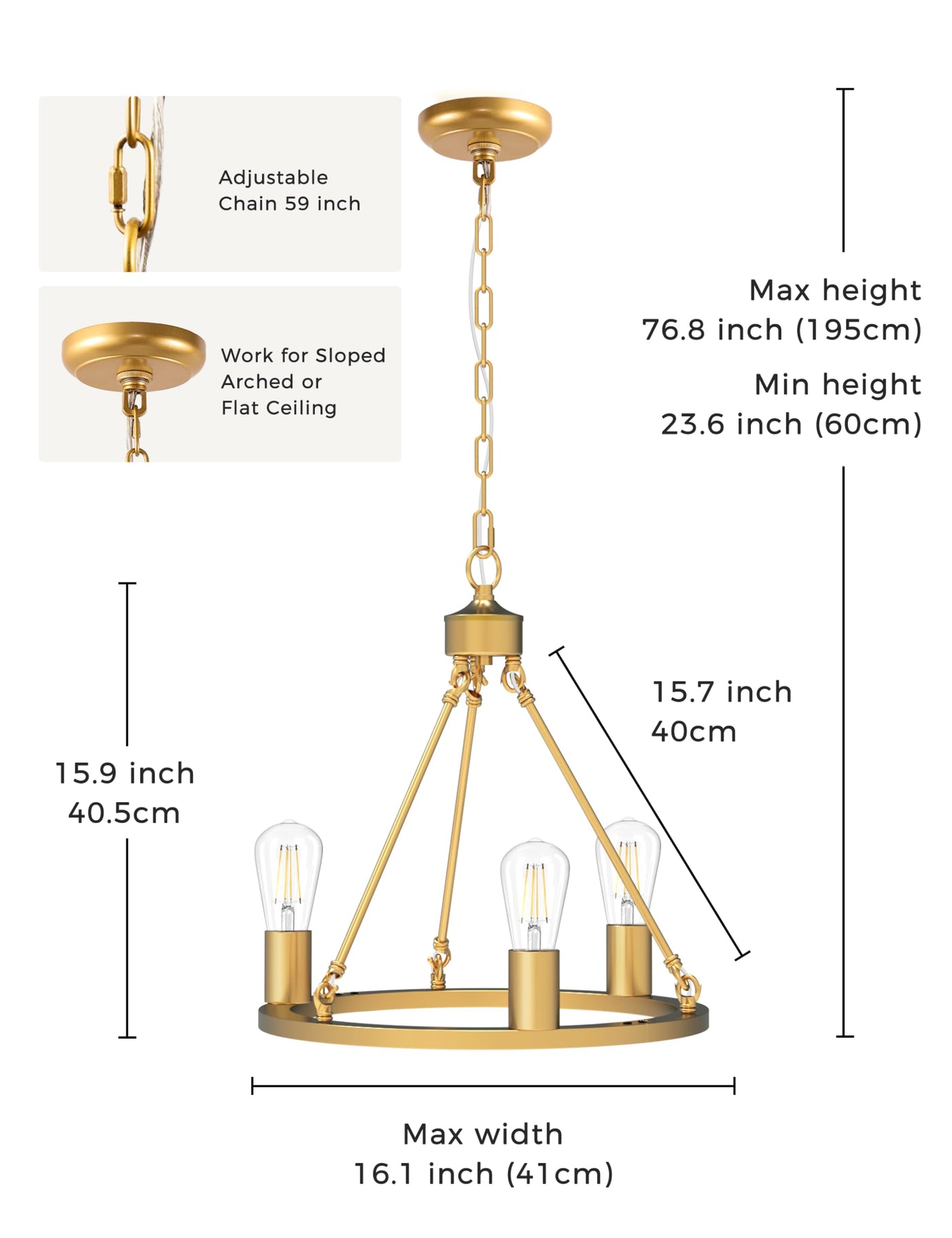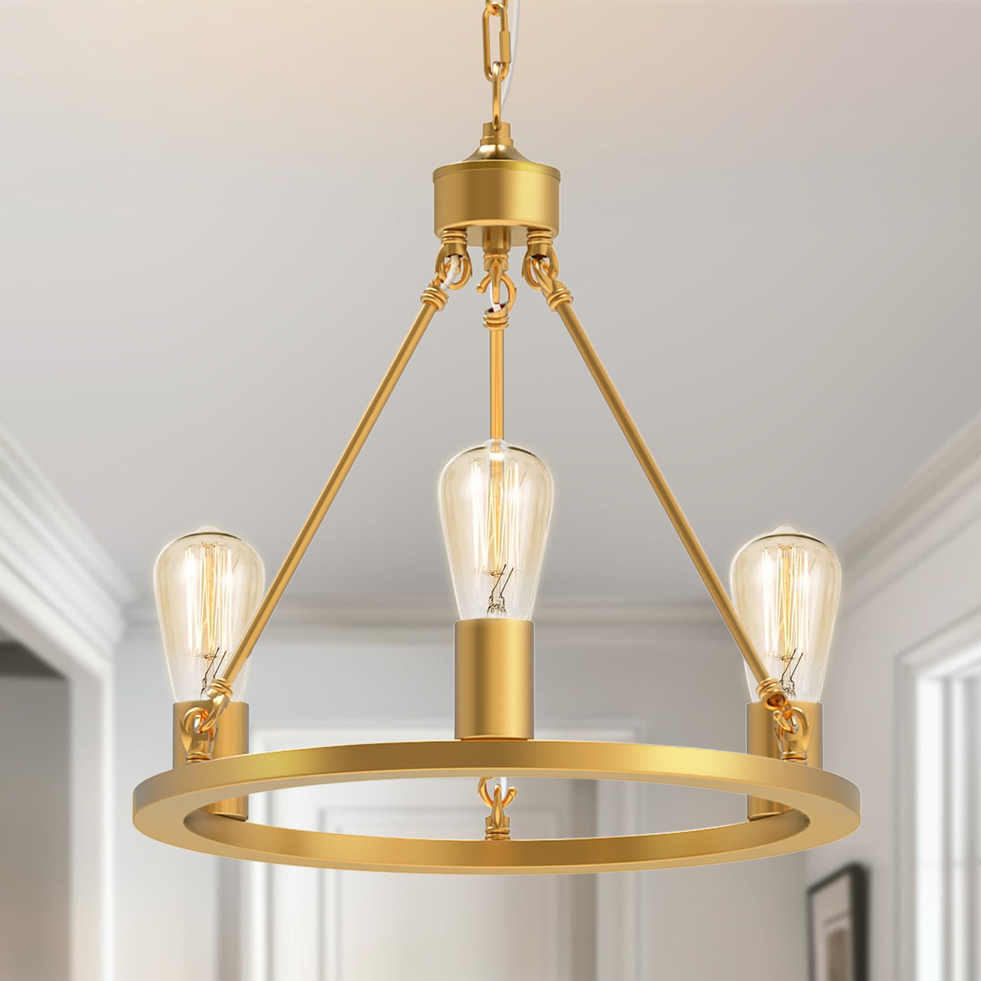 L Lohas Led Gold Farmhouse Chandeliers For Dining Room, 3-Light Wagon Wheel Chandelier Over Table, Height Adjustable, 16'' Dinin