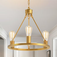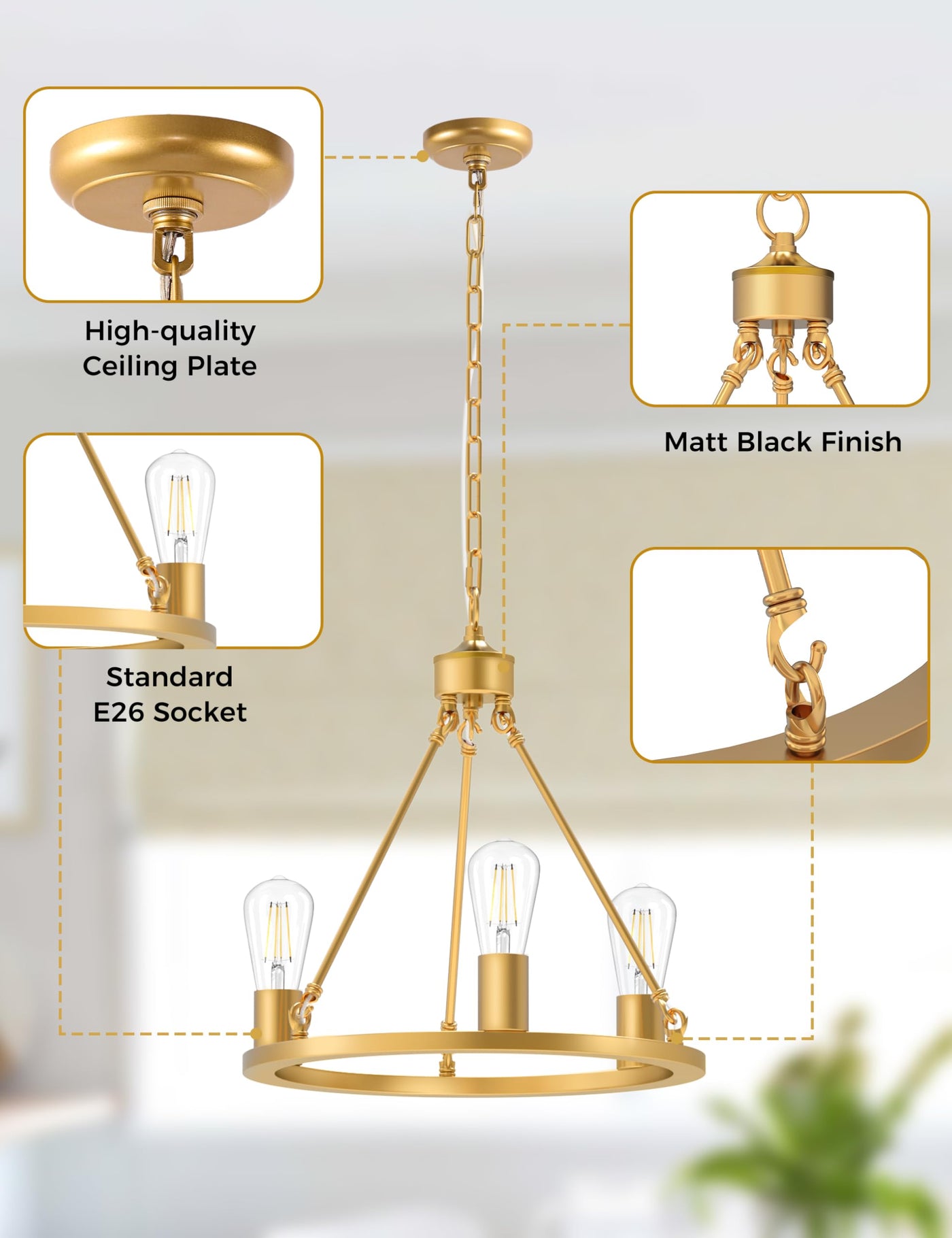 The L LOHAS LED gold farmhouse chandelier features a stylish wagon wheel design in durable gold metal, perfect for adding a warm, romantic touch to any room. With a 59 adjustable chain, you can customize the hanging height. It accommodates three E26 bulbs (max 60W each) and is fully dimmable with a compatible dimmer switch. Easy to install and low-maintenance, this versatile chandelier suits various interiors and is available in both gold and black finishes. (Bulbs and dimmer switch not included.)