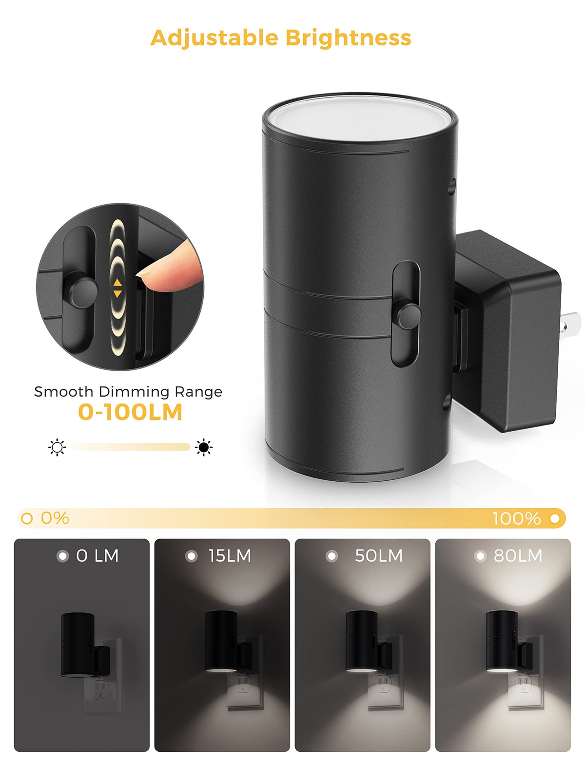 Q: How does the dimming function work on this night light?A: The night light includes a dimmable adjustment button that allows you to set the brightness from 0 to 100 lumens. This flexibility lets you customize the light intensity based on your preferences and needs at different times of the day.