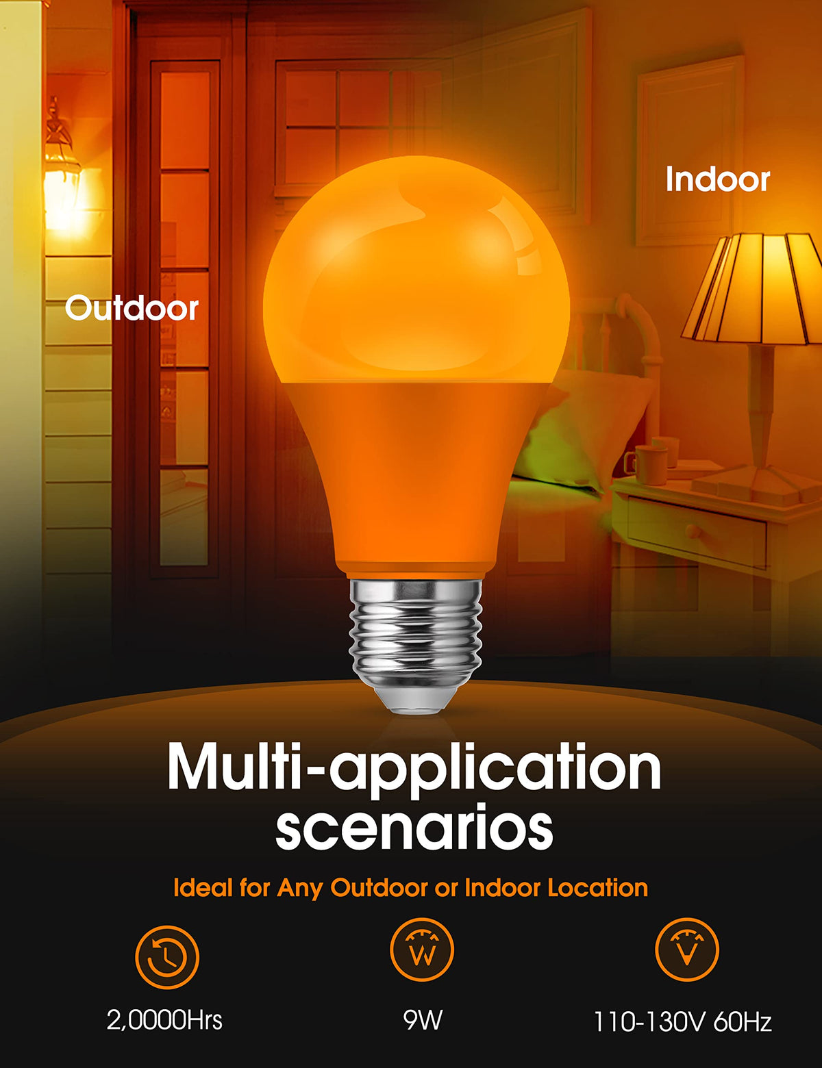 Constructed from durable aviation aluminum and well-made plastics, this bulb ensures longevity and shatter-resistant performance, making it suitable for both indoor and outdoor use. With a luminous intensity of 720 lumens, it delivers bright and vivid orange lighting while consuming only 9 watts of energy, equivalent to a traditional 60-watt incandescent bulb. The E26 medium screw base allows for easy installation in standard sockets, providing versatility across different light fixtures.