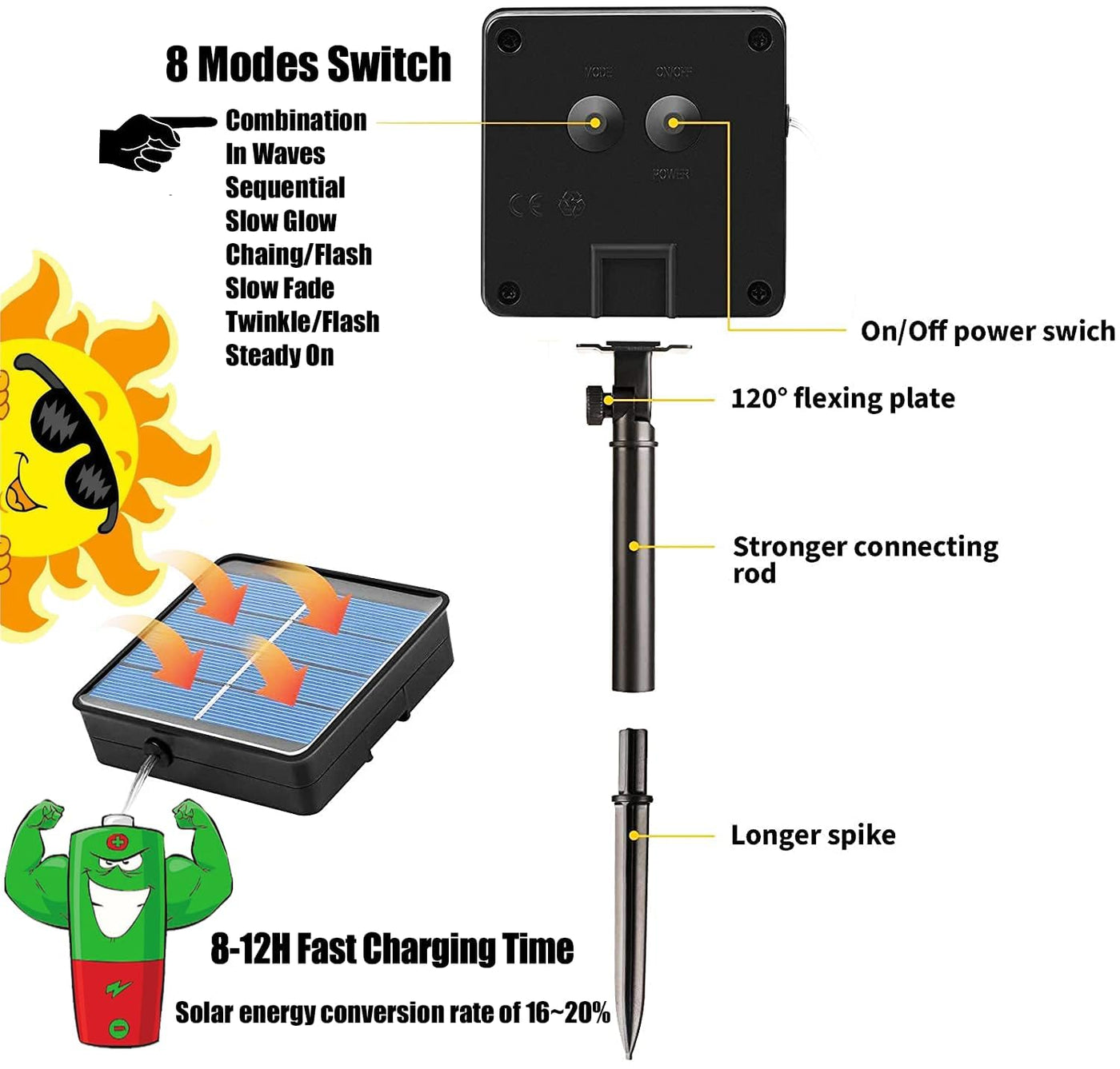 ? High Energy Efficiency: Equipped with 100 low-heat LED chips and a remarkable energy conversion rate of up to 19%, our solar lights are eco-friendly and safe to use, providing 8-12 hours of illumination on a full charge.