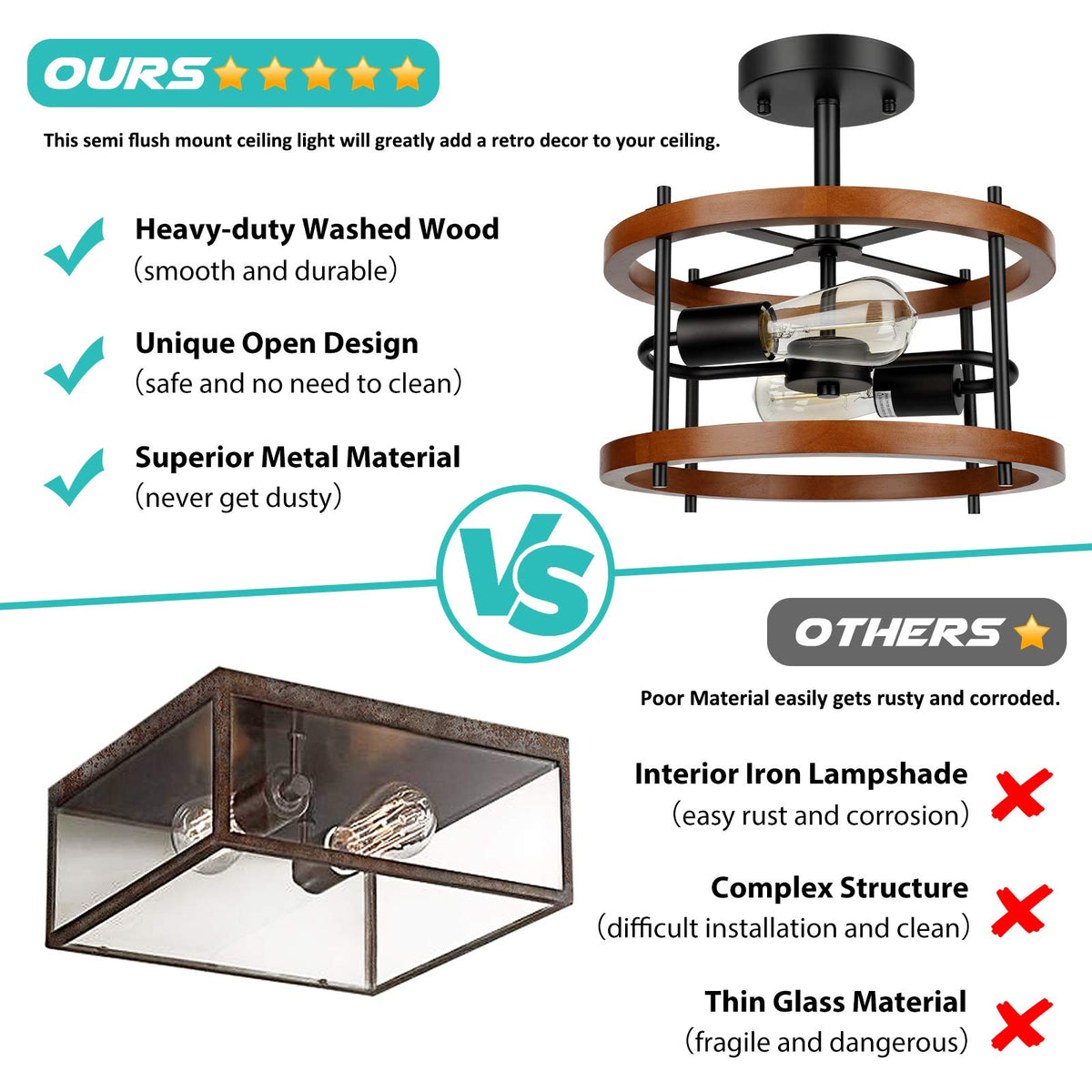Lakumu 2-Light Retro Semi Flush Mount, Rustic Vintage Wood & Black Metal Industrial Farmhouse Ceiling Lamp For Hallway, Entryway