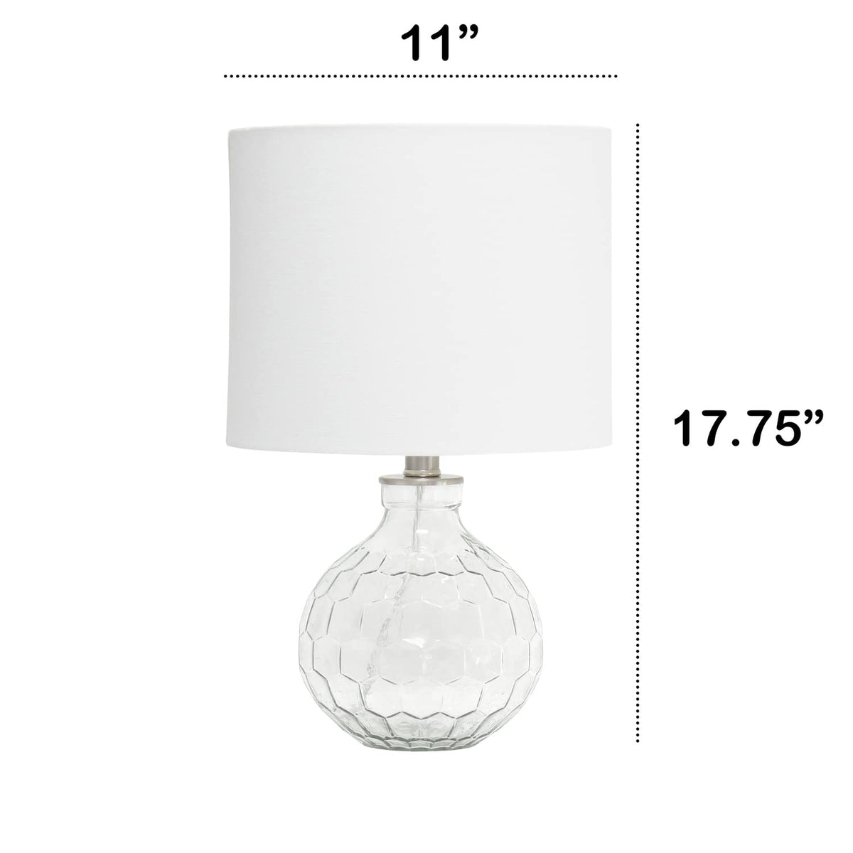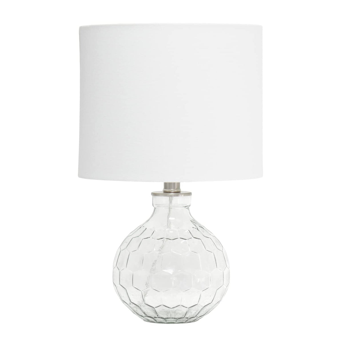 A stunning addition to your home decor, this modern lamp effortlessly combines functionality with sophisticated style. The unique design features a transparent base with an elegant etched honeycomb pattern, paired with a crisp white drum fabric shade, making it a versatile choice for various spaces. Perfectly suited for bedside tables, living room side tables, or entryway accents, this lamp enhances any room with its neutral yet slightly sophisticated aesthetic.