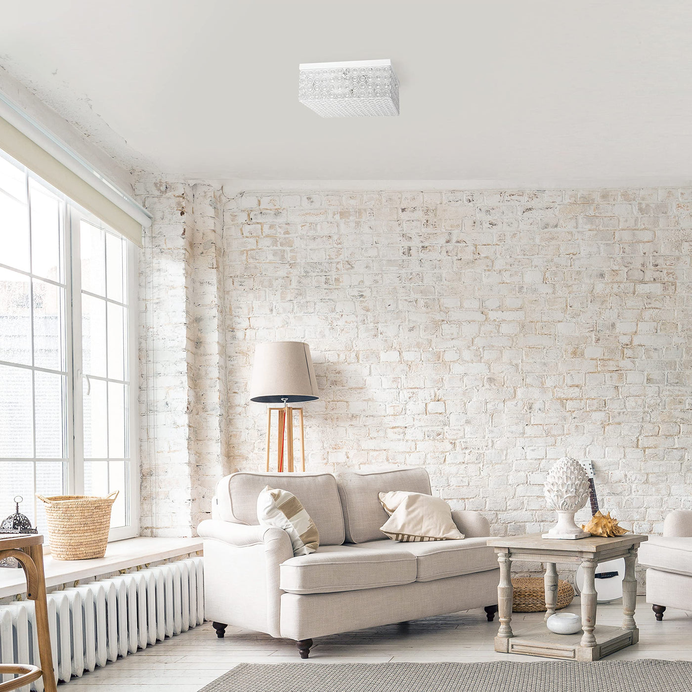 Crafted with well-made materials, this flush mount features a flawless white base adorned with elegant K5 crystals. The thoughtful design showcases four rows of crystals, creating a stunning visual effect when illuminated. It is not only a source of light but also a decorative element that adds glamour to your space. With a compact size of 12 inches square and a height of 5 inches, it fits effortlessly into various settings, from living rooms to bedrooms.