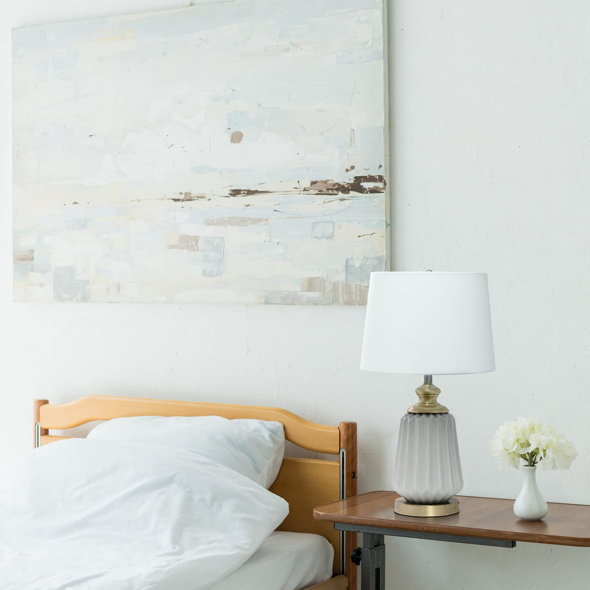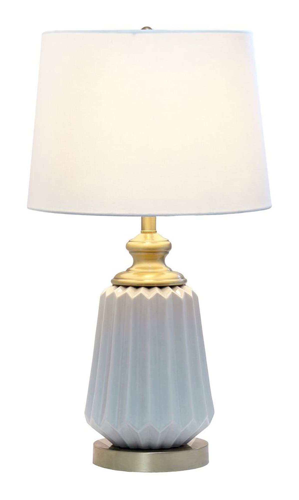 Q: What materials are used in the construction of this table lamp?A: The lamp features a soft gray ceramic base and a white TC fabric shade. The base is accented with antique bronze metal, adding a vintage touch to its modern design.