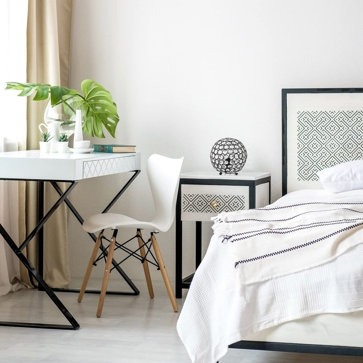 Q: What are the dimensions of the Lalia Home Elipse Table Lamp?A: The table lamp measures 7.75 inches in length and width, with a height of 8 inches, making it a perfect fit for various tabletop surfaces.