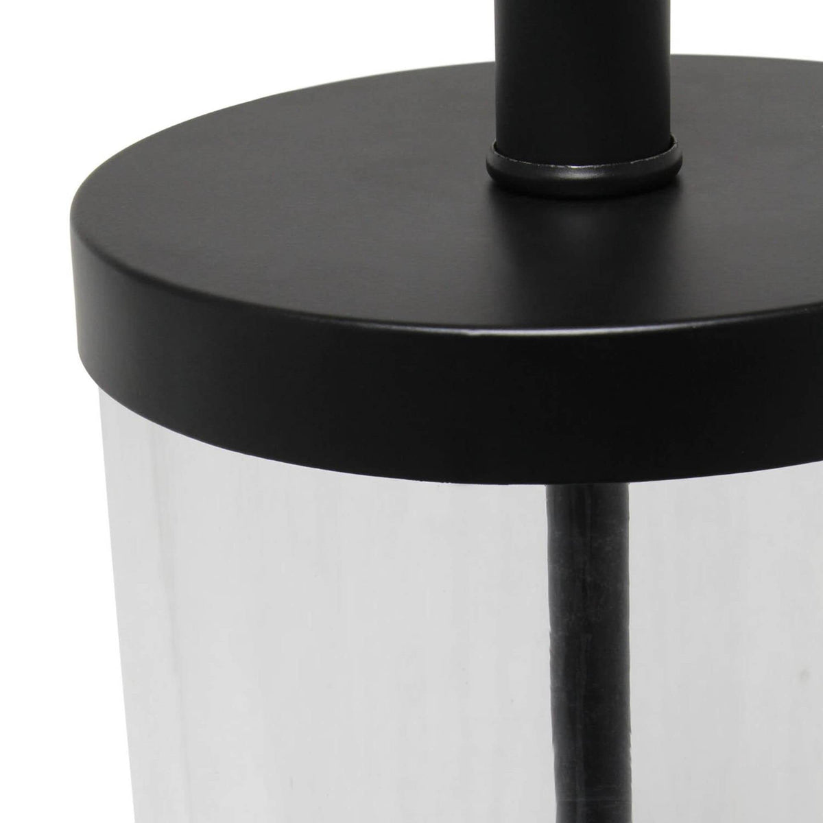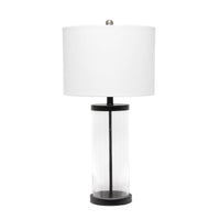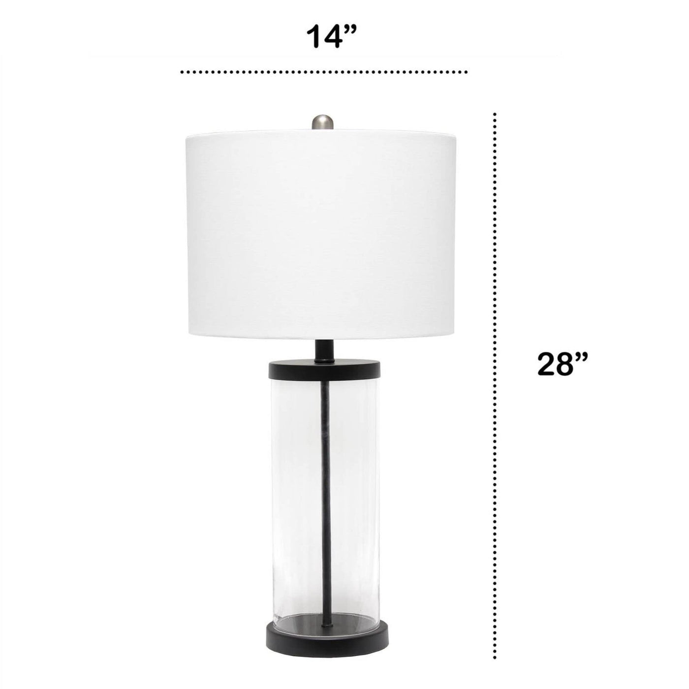 Classic yet contemporary this lamp will light up any room in your home with style! This lamp features a clear glass cylindrical base with black metal on top and bottom for a clean sophisticated look. Perfect for your living room bedroom office or anywhere you need to add a tasteful update! Material Breakdown: 48% Fabric 48% glass 3% metal 1% plastic Easily accessible rotary switch located on the socket. Shade Security: Harp & Finial.Shade Shape: Drum.