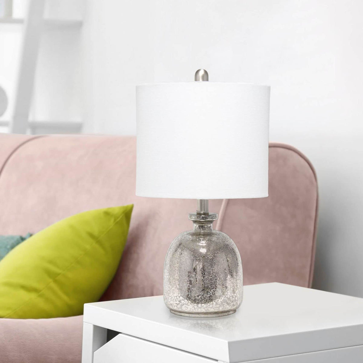 With a textured glass base and white fabric drum shade, this lamp is sure to update any room in your home with a little charm. This lovely lamp is crafted with an open bottom glass base in mercury. Perfect for adding the little refresh to your living room, bedroom, foyer or office that you've been looking for! Material Breakdown: 48%, Fabric, 48%, glass, 3%, metal, 1% plastic, Easily accessible rotary switch located on the socket.