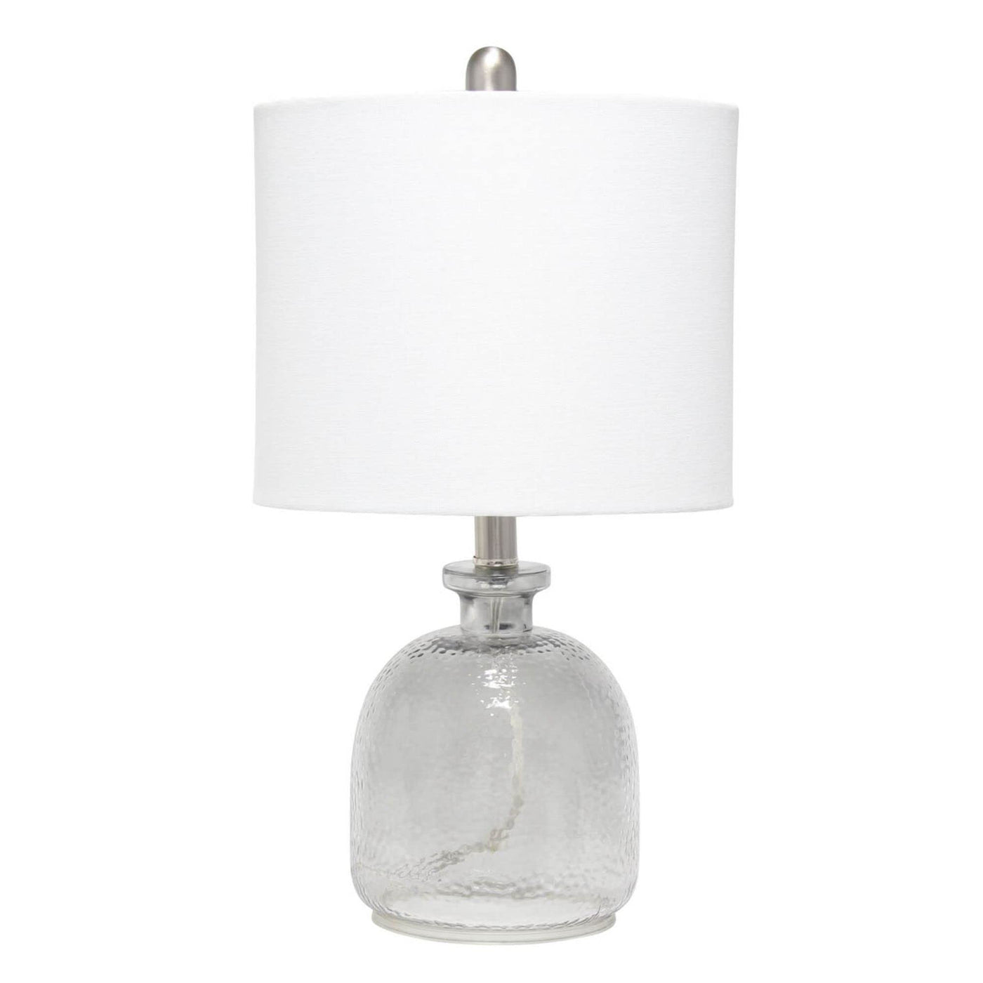 With a textured glass base and white fabric drum shade, this lamp is sure to update any room in your home with a little charm. This lovely lamp is crafted with an open bottom glass base in a transparent gray color. Perfect for adding the little refresh to your living room, bedroom, foyer or office that you've been looking for! Material Breakdown: 48%, Fabric, 48%, glass, 3%, metal, 1% plastic, Easily accessible rotary switch located on the socket.
