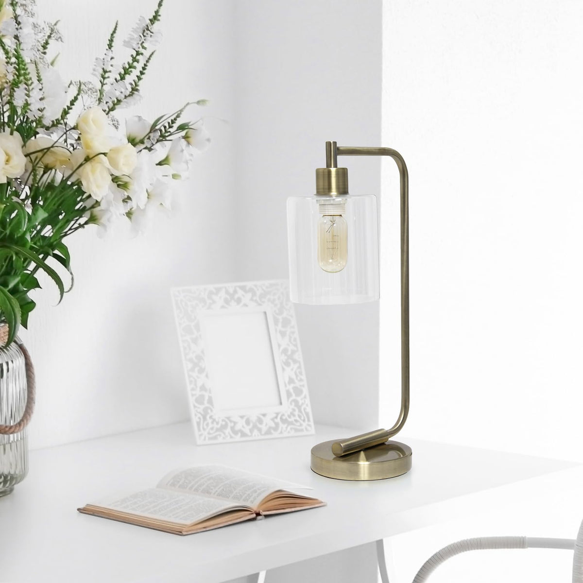 Simple yet modern, this desk lamp is sure to add a touch of style to any room in your home. This beautifully crafted iron desk lamp combines a simple base with a curved arm and a clear cylinder glass shade for a sleek and sophisticated combination. Perfect for your desk, foyer or bedside table for a modest, refined look in trendy lighting. HELPFUL TIP: To get the complete industrial look, we recommend using a decorative Edison/Vintage bulb (not included). Clear Glass Shade. Antique brass finish. 1 x 40W standard medium base bulb (not included) required. For full vintage look, Type T45 Edison bulb is recommended. More color options available!. On/off switch on cord. Sophisticated farmhouse look. Does the item contain wood: No. Height from Base to Shade: 10. Height from Base to Socket + Socket: 15 + 1.