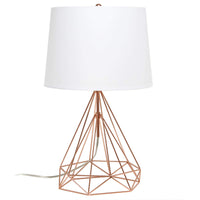 Q: What materials are used in the construction of this table lamp?A: This table lamp features a geometric metal base finished in rose gold, complemented by a white fabric tapered shade. The material composition includes 65% metal, 30% fabric shade, and 5% power cord.