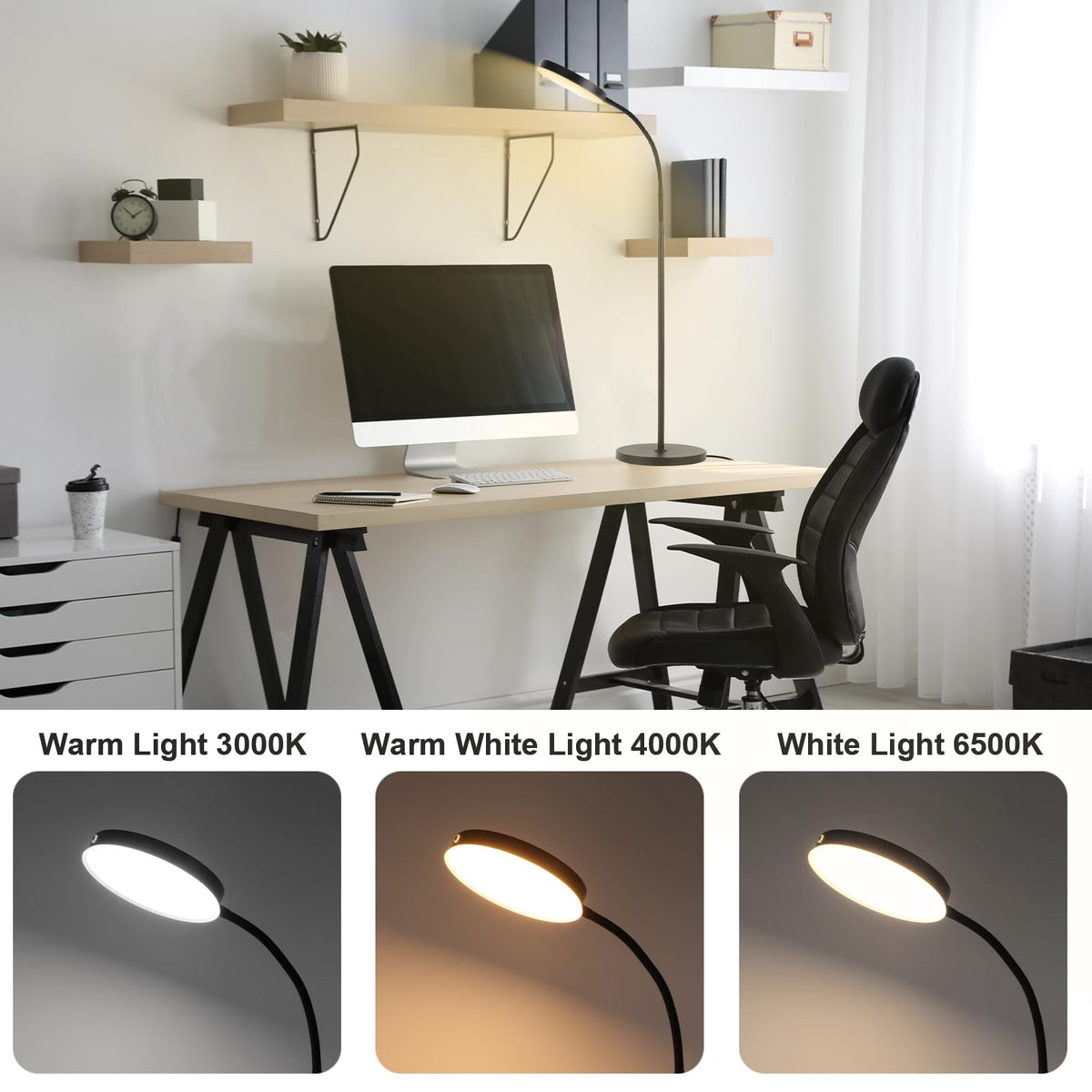 Q: What are the main features of the LALISU Floor Lamp?A: The LALISU Floor Lamp features touch control for easy brightness and color temperature adjustments, stepless dimming from 5% to 100%, three color temperature options (3000K to 6500K), a height-adjustable design, a 360-degree gooseneck for directional lighting, and a modern aesthetic suitable for various living spaces.