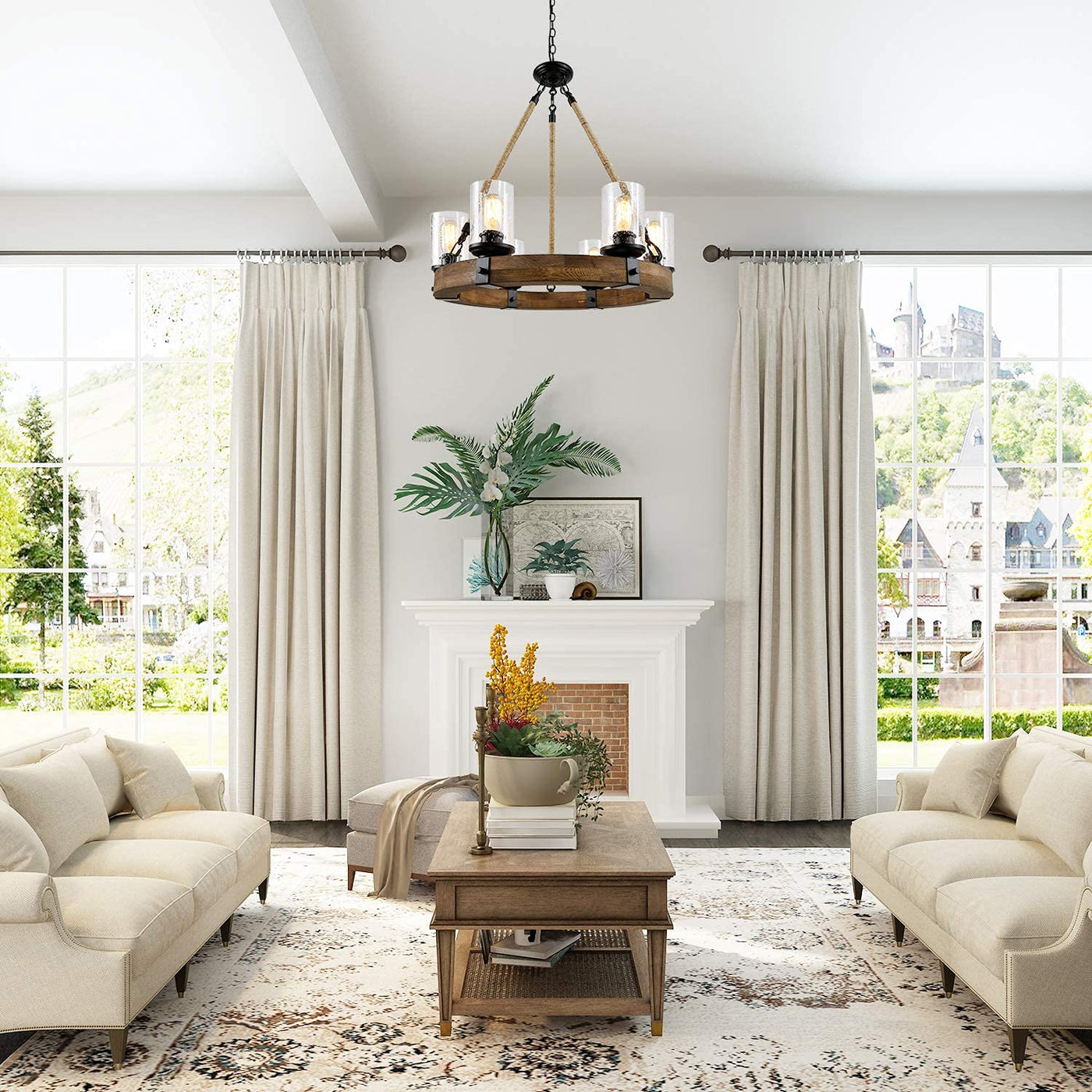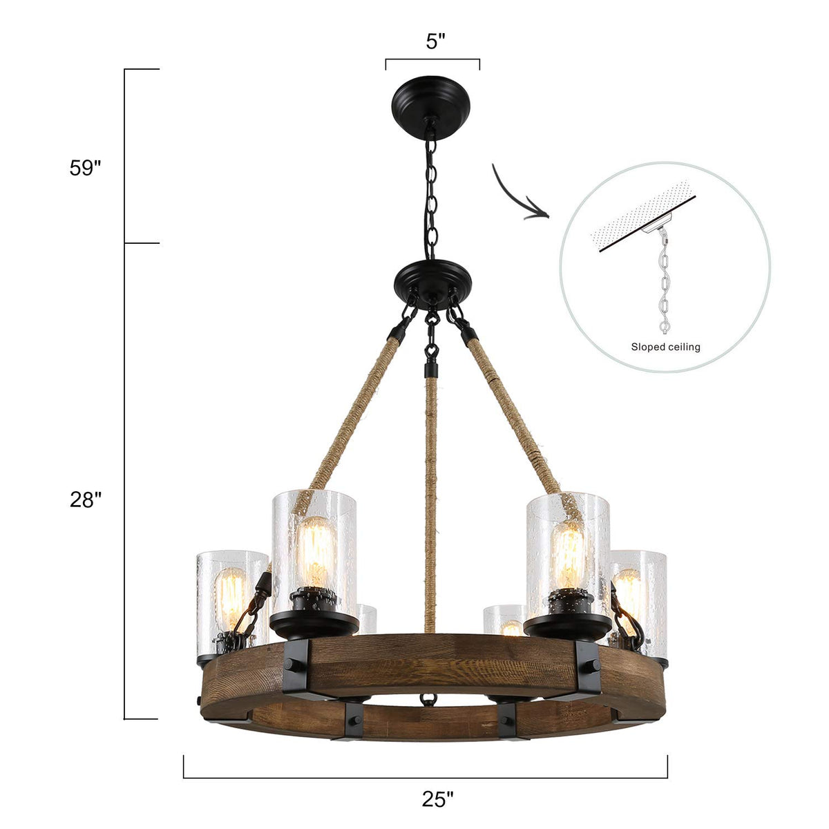 Rustic Chandelier - Farmhouse Chandelier Features A Wagon Wheel Shaped And High Quality Real Wood Frame Along With Clear Seeded Glass, Brings A Vintage Farmhouse Look To Your Home. It Transforms Natural Rope From A Functional Material To A Unique Decorative Element, Adding Color And Texture That Combines Nicely With The Circular Wood Frame. Creates A Warm And Welcoming Glow In The Entryway Or Dress Up Your Dining Room For An Upcoming Dinner Party With This Eye-Catching Chandelier. | Ideal Dimension - Round Canopy: 5