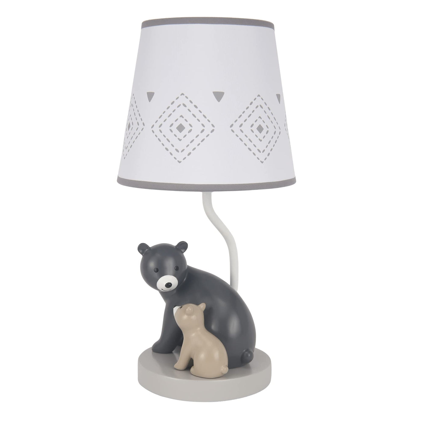 Add a soft glow to your child’s room with this custom mommy and baby bear lamp. This 3-dimensional hand-painted resin lamp with shade is approximately 14” in total height. The lamp shade has a dotted style diamond shaped design on a white ground with gray trim. Included is an energy efficient light bult equivalent to 60 watts and it uses less energy.
