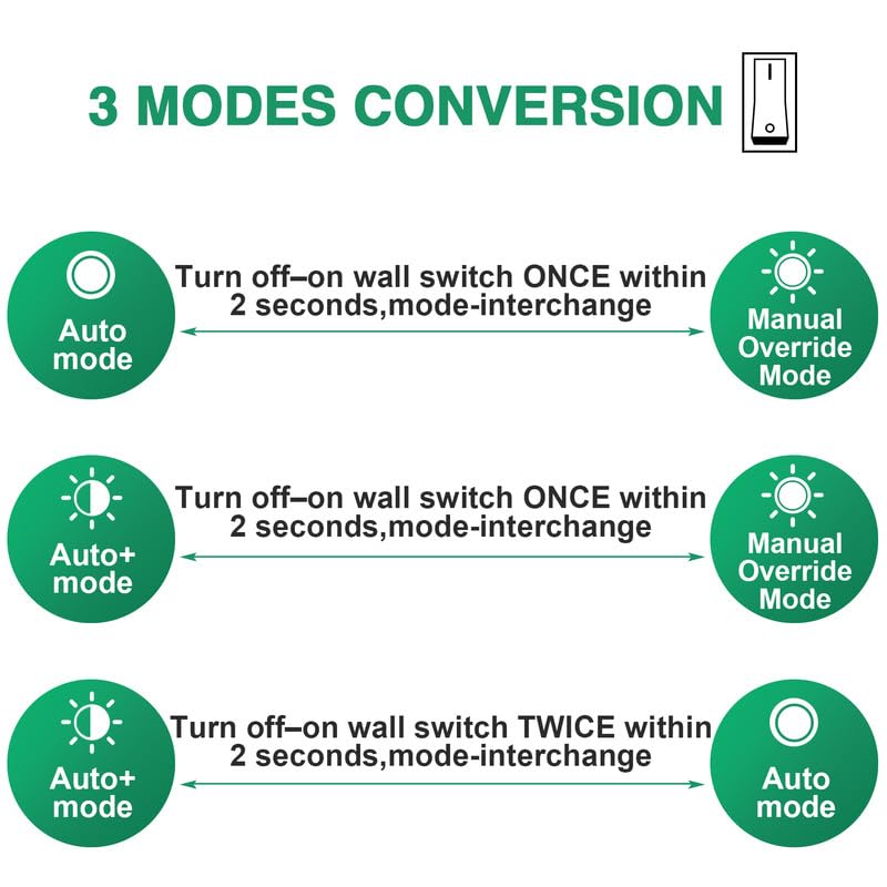 - **Manual Override Mode**: Ideal for outdoor gatherings, the wall light offers a manual override mode that allows for continuous illumination. Just toggle the wall switch within 0.5-2 seconds to activate this mode, perfect for parties, ceremonies, or any events that require extended lighting.