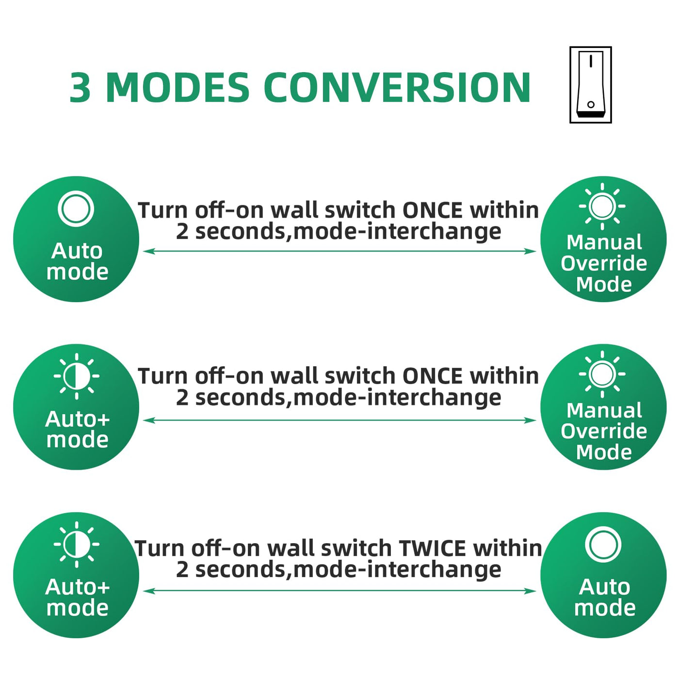 Q: How do I activate the manual override mode for extended illumination?A: To activate the manual override mode for long-term illumination, simply turn the wall switch 'off' and then 'on' within 0.5 to 2 seconds. This mode allows for continuous lighting during occasions like outdoor parties or gatherings, but it will revert to automatic operation during the daytime.