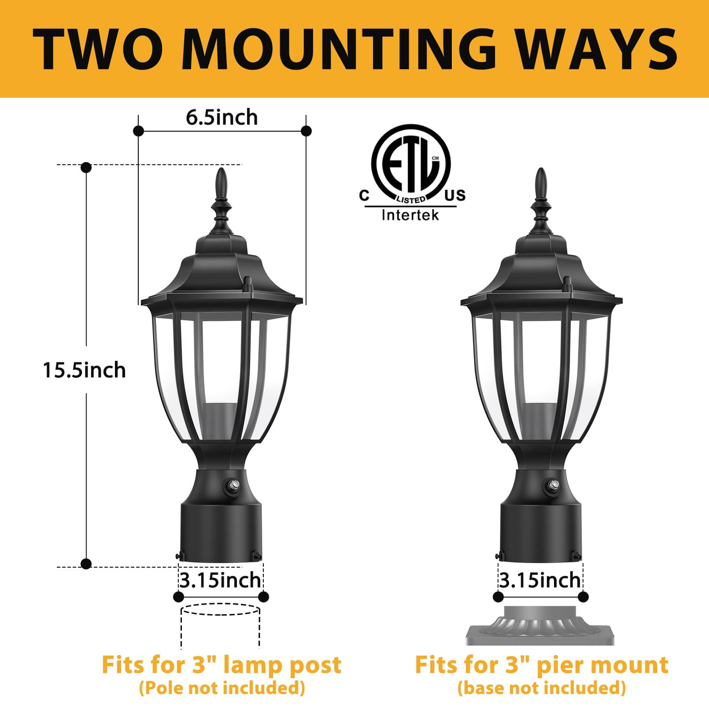 Q: How is the installation process for the Lamomo post lights?A: Installation is straightforward, as the Lamomo post lights come with all necessary mounting hardware and a user manual. They can be mounted on a 3" mounting base or directly onto a 3" post or pole.