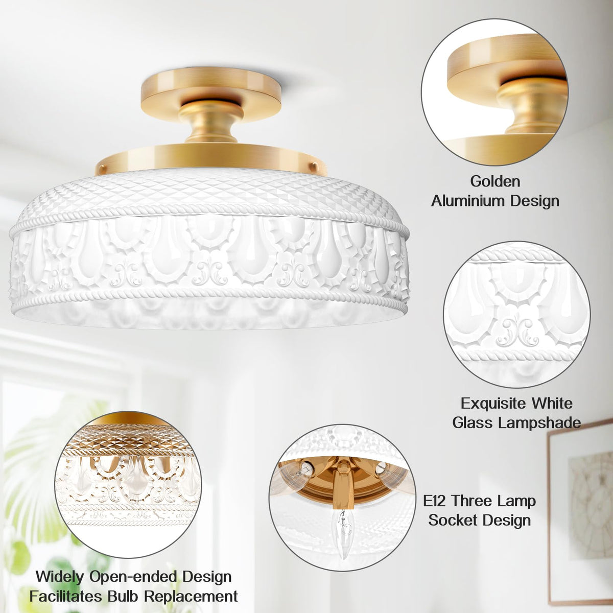 Lamomo Semi Flush Mount Ceiling Light,White Glass Shade Gold Hallway Light Fixture,3-Bulb Globe Glass Close To Ceiling Scone,Ind