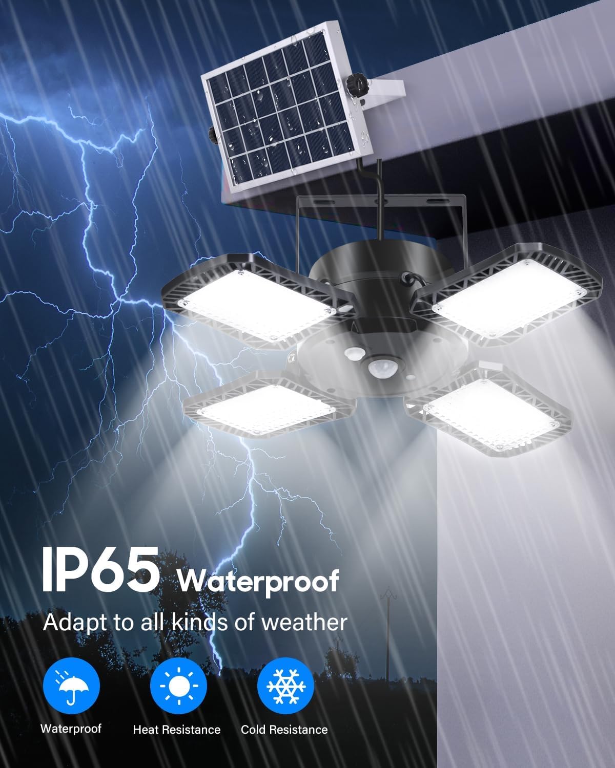 - **Durable Waterproof Design**: Rated IP65 for waterproofing, this solar light is built to withstand all weather conditions, making it reliable for garages, tool sheds, gardens, and yards. The 4400mAh large-capacity battery ensures long-lasting performance, charging in just 8 hours and providing up to 10 hours of stable operation.