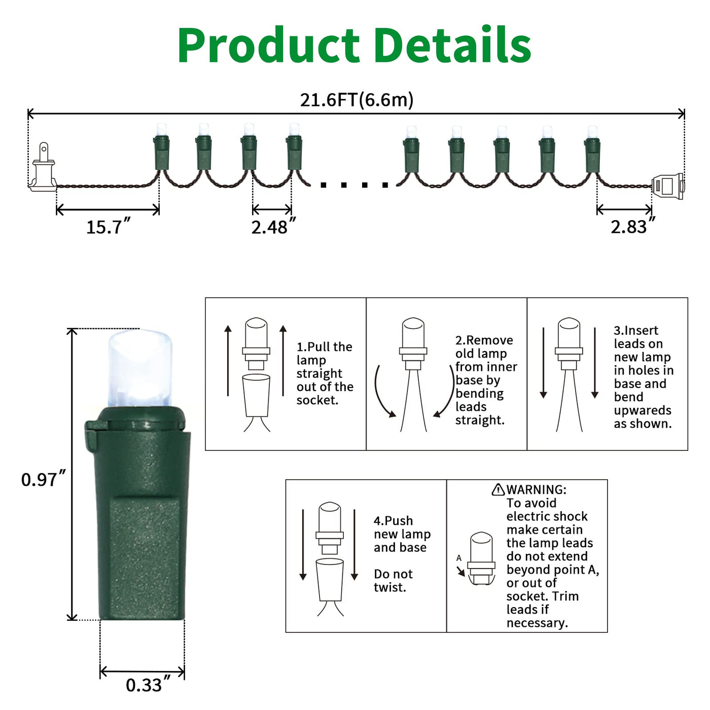 Q: Are the LED bulbs of the LAMPHOME string lights replaceable?A: No, the LAMPHOME string lights feature a non-removable LED bulb/base construction. This design helps to seal out moisture, eliminates corrosion, and extends the overall bulb life.