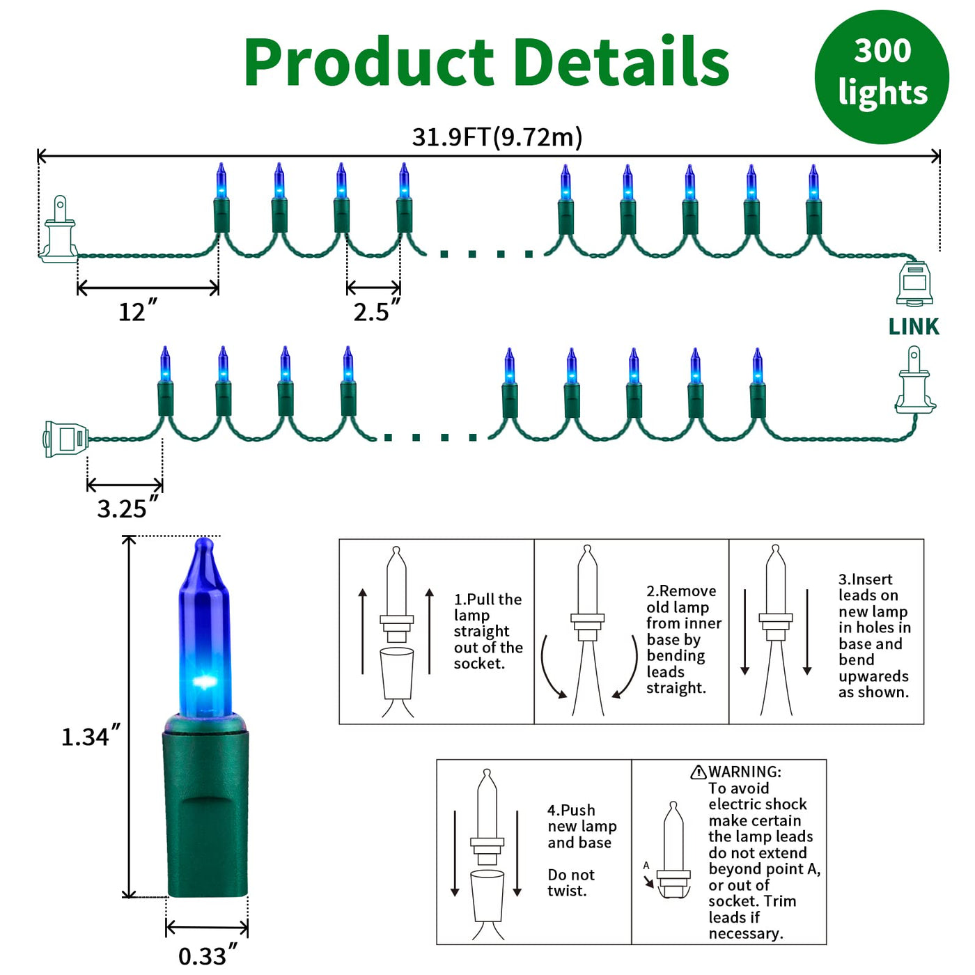 Q: How long are the LAMPHOME Halloween lights and how many lights are included?A: The LAMPHOME Super-Bright Extendable Purple Halloween Lights come in a 2-pack, with each string measuring 31.9 feet long, totaling 63.8 feet with 300 incandescent mini lights (150 lights per string).