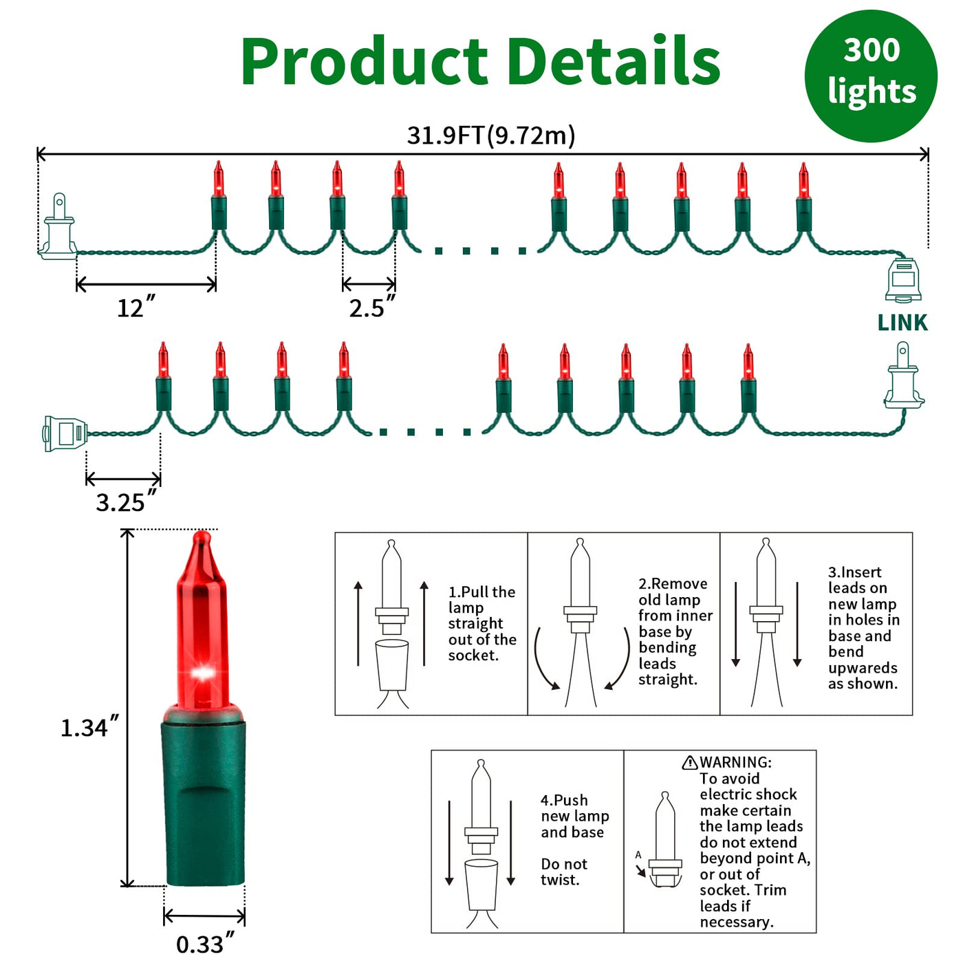Q: How long are the LAMPHOME Christmas lights and how many bulbs are included?A: The LAMPHOME Christmas lights come in a 63.8ft length, consisting of 300 incandescent mini bulbs, making them perfect for both indoor and outdoor decorations.