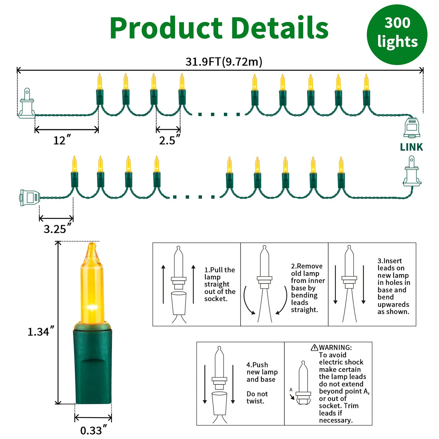 Lamphome Super-Bright Extendable Yellow Christmas Lights Decoration 300 Lights 63.8Ft(2Pk Of 150L) Ul Certified Mini Bulb String Lights Set For Outdoor Christmas Tree Garden Holiday Party Patio Decor