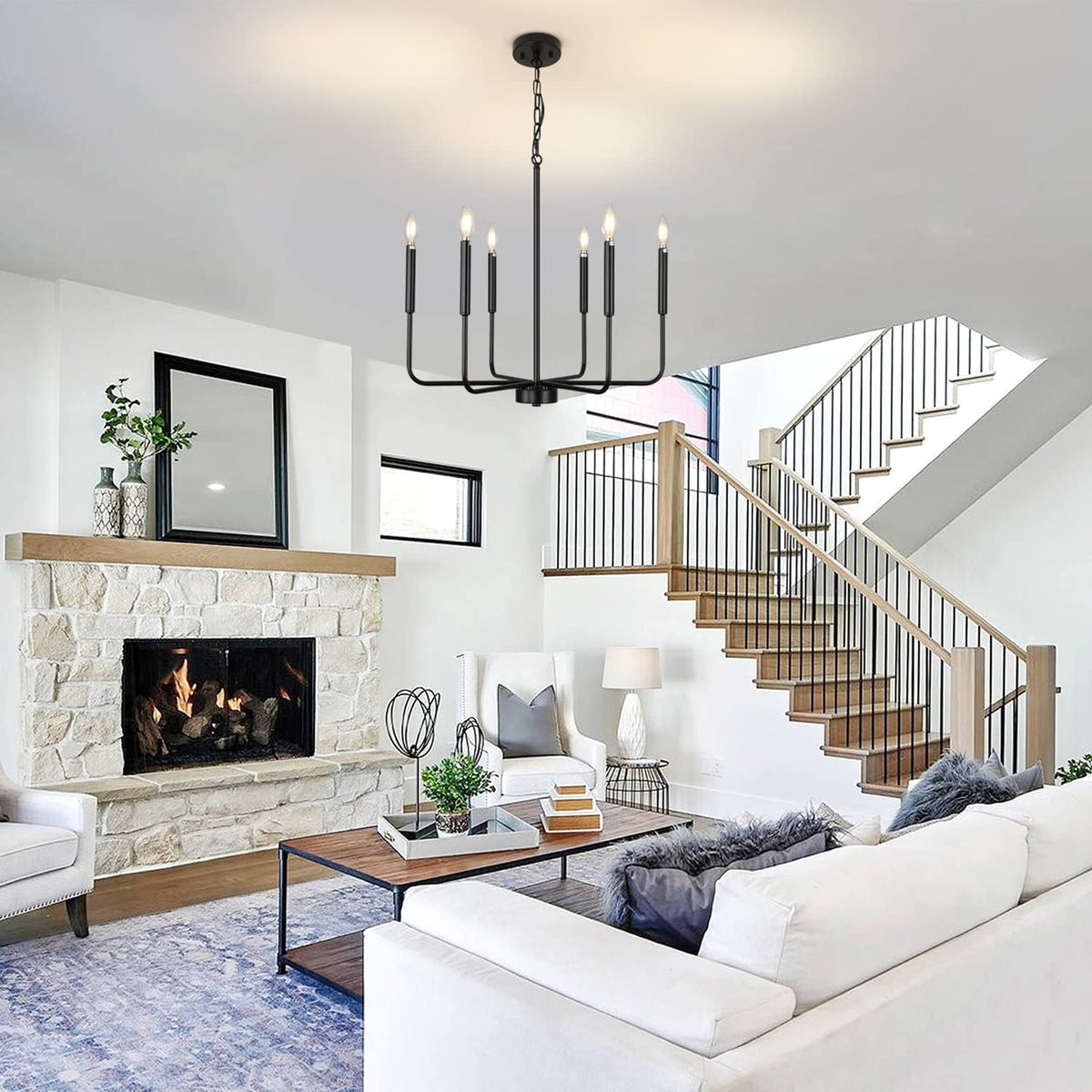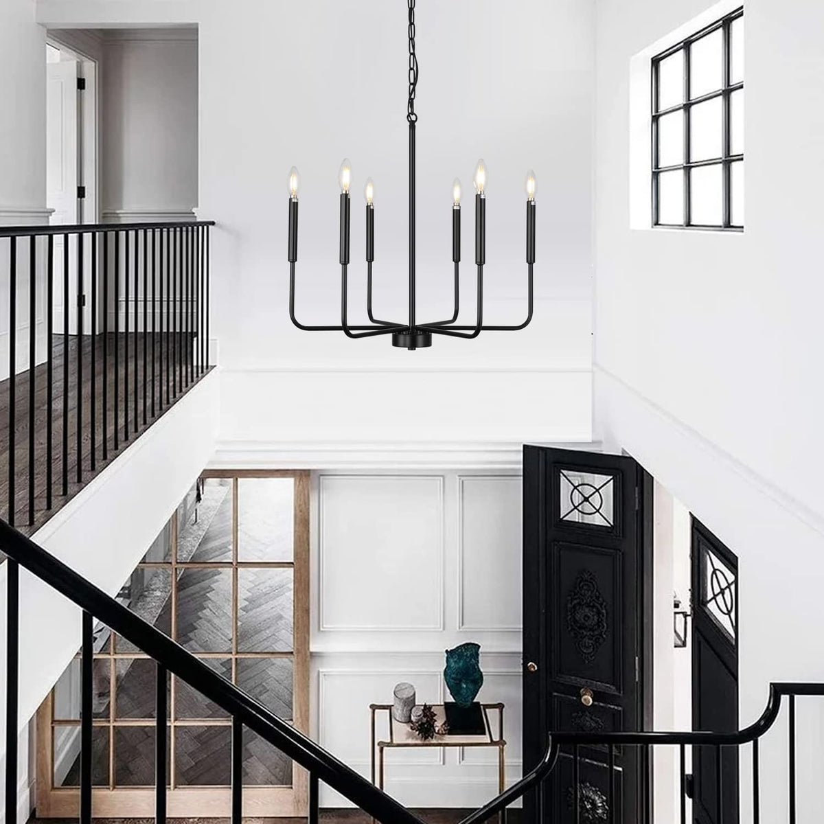Classic Design: This striking black chandelier features 6 elegant candle-shaped stems that create a warm and inviting atmosphere, perfect for enhancing any room's decor.