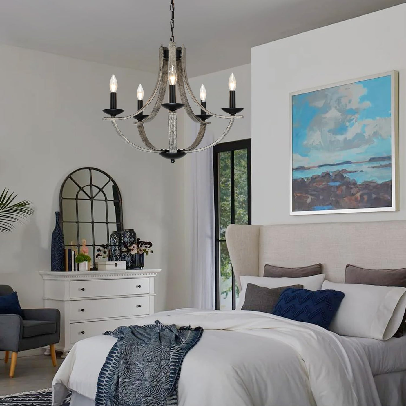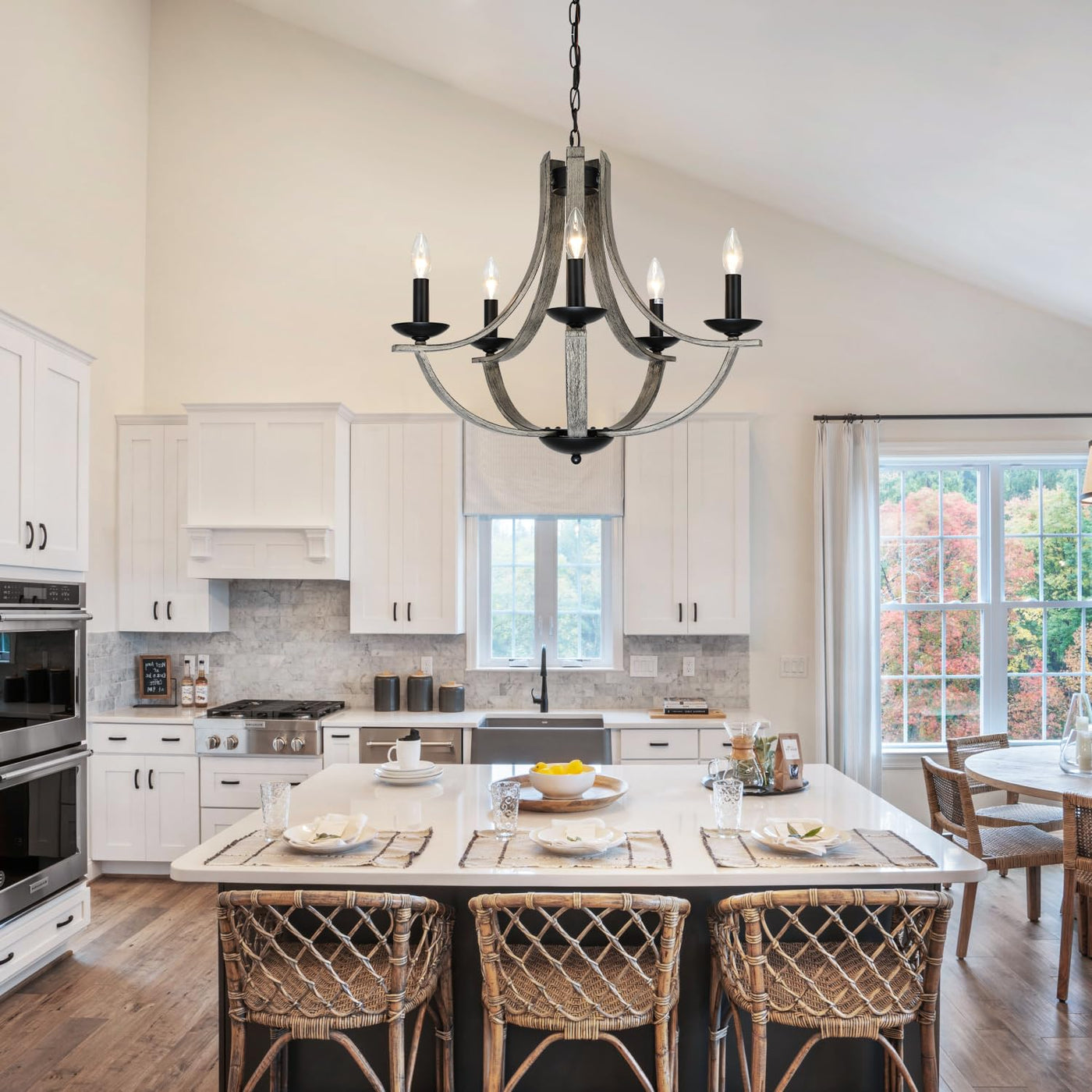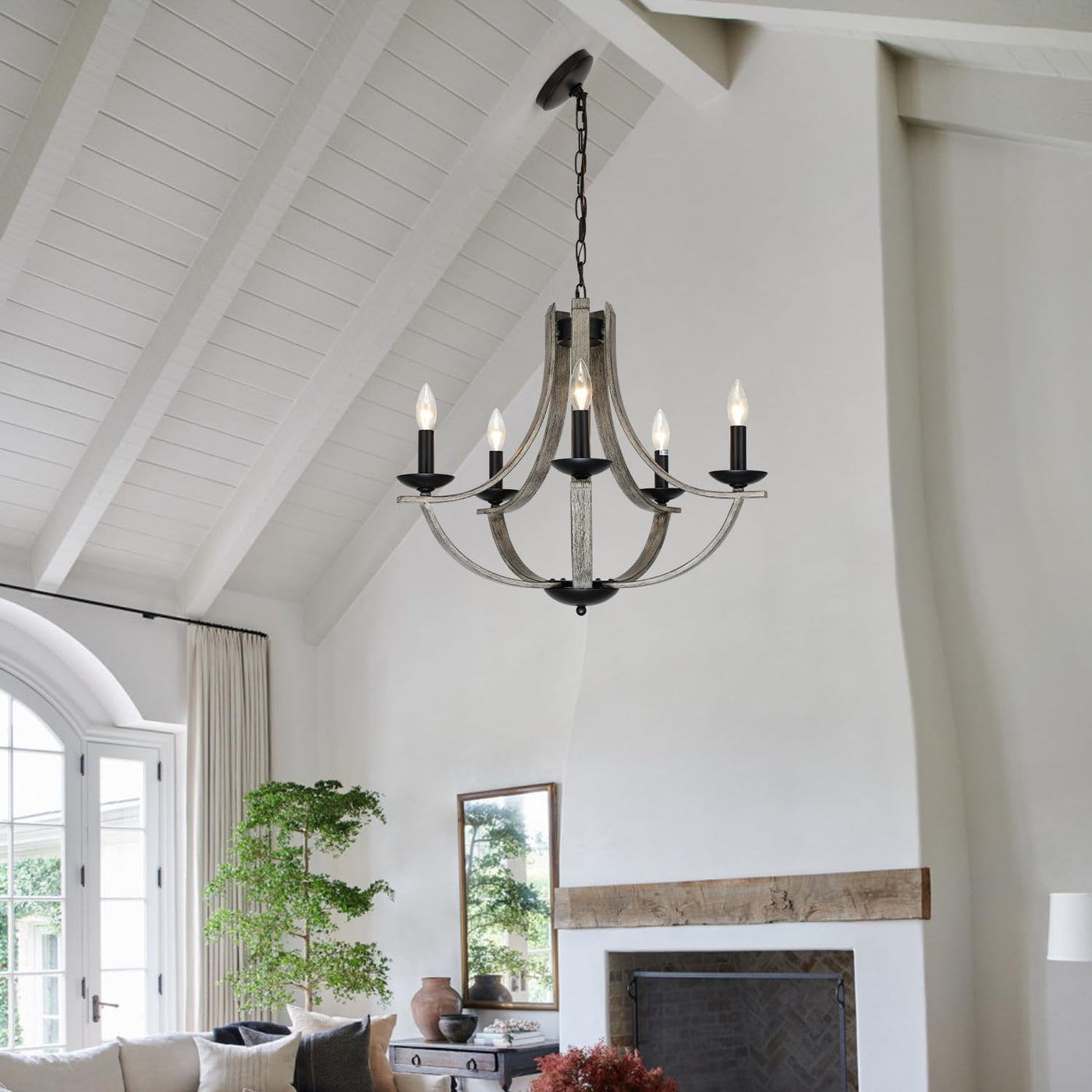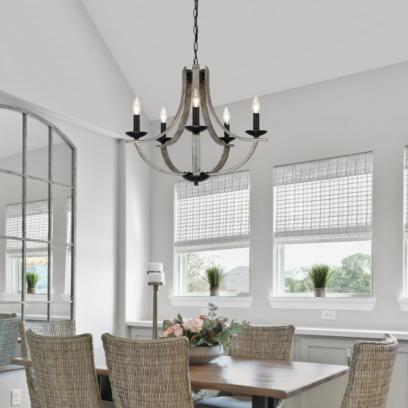 Lampkeduo Rustic Chandeliers For Dining Room Light Fixture 5-Light 24 Inch Faux Wood Texture Hanging Lighting Fixtures Farmhouse Candle Chandeliers For Living Room Kitchen Island Foyer Entryway