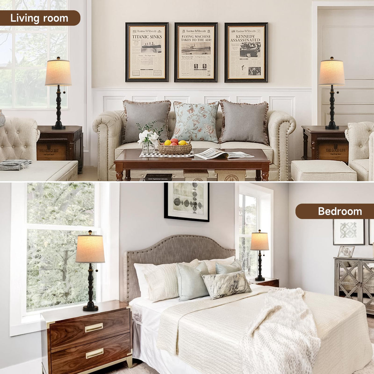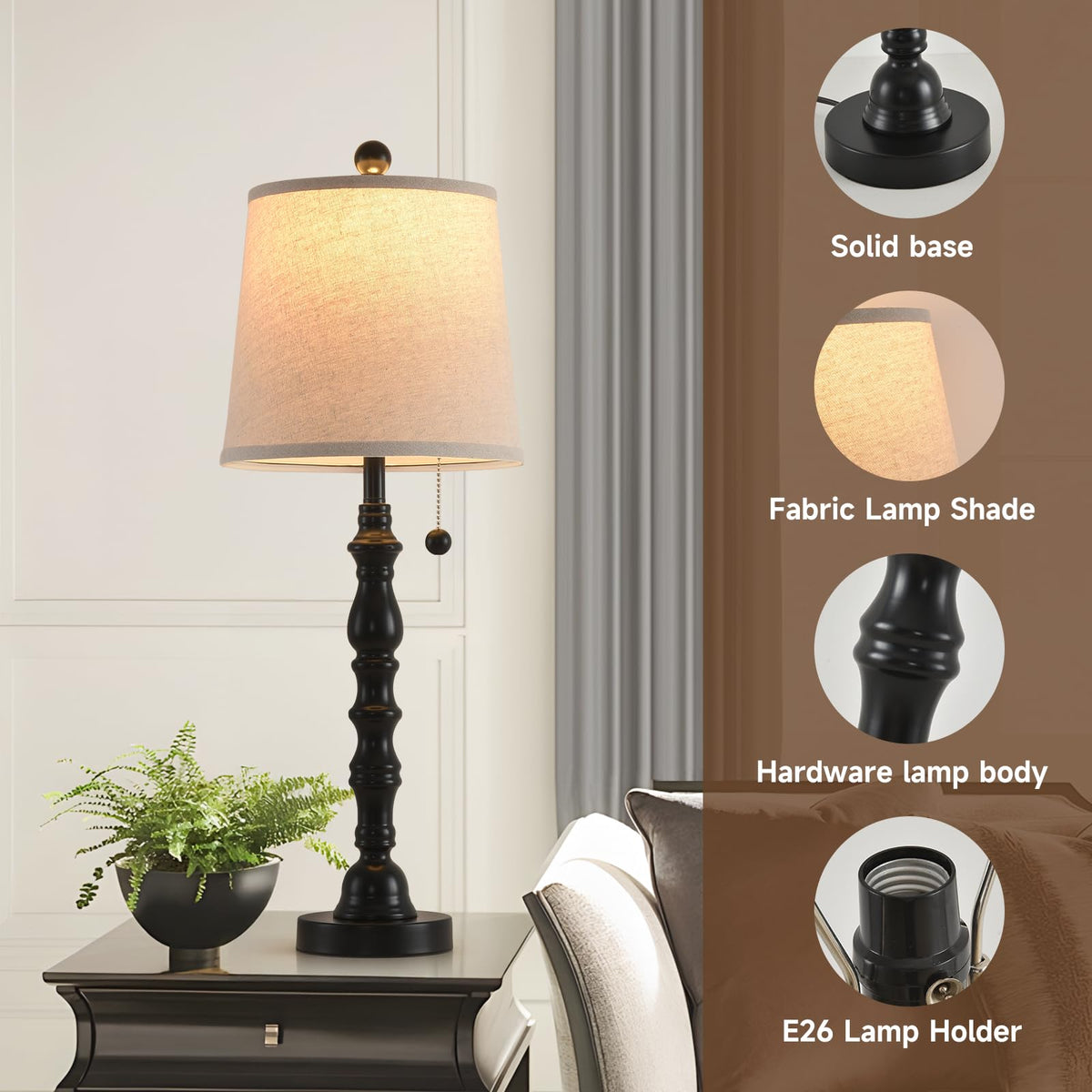 Minimalist 2-Light Table Lamp Lights Up Diverse Living Spaces Modern minimalist style, meet the perfect balance of aesthetics and practicality. The combination of 2 table lamps can easily match the atmosphere of the living room, the cozy bedroom and the elegant dining room. E26 lamp base design, up to 60W power, compatible with a variety of light bulbs, changing the atmosphere of light and shadow as you wish, without bulbs for you to reserve space for personalized choice. Elegant black, pure white, vintage sepia, fresh Turquoise, four colors to choose from, to meet different home styles and personal taste. Whether it is on the bedside table to accompany you to enjoy reading time, on the dining table to create a cozy dining atmosphere, or on the coffee table to light up the leisure moment, it can be accurately integrated into the magic of light, activate the charm of space. Add style to home decoration, open a new chapter of colorful life lighting