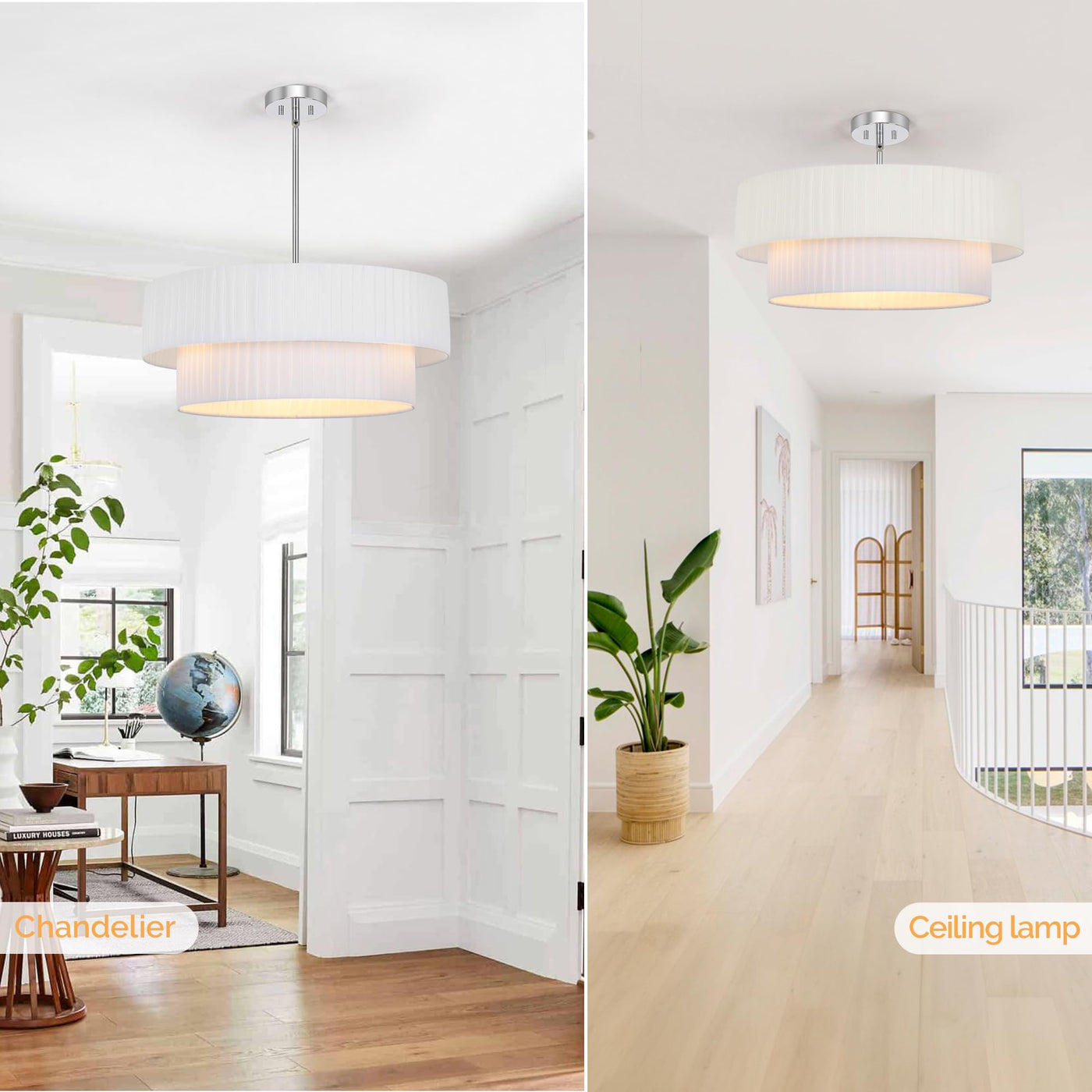 Lamqee 3-Light Modern Drum Chandelier, 2-Tier Semi-Flush Mount Pendant Light Fixtures With Fabric Lampshades, 20 Hang Ceiling