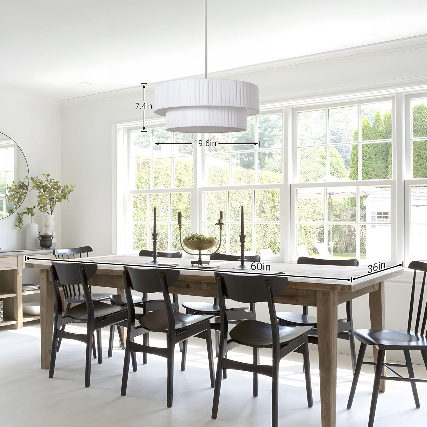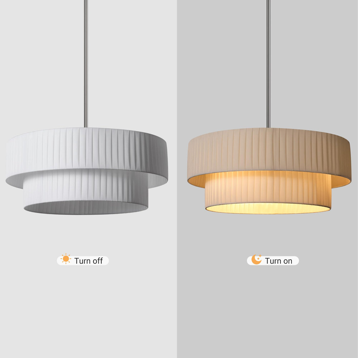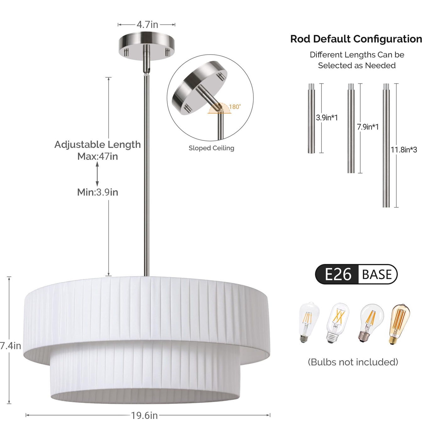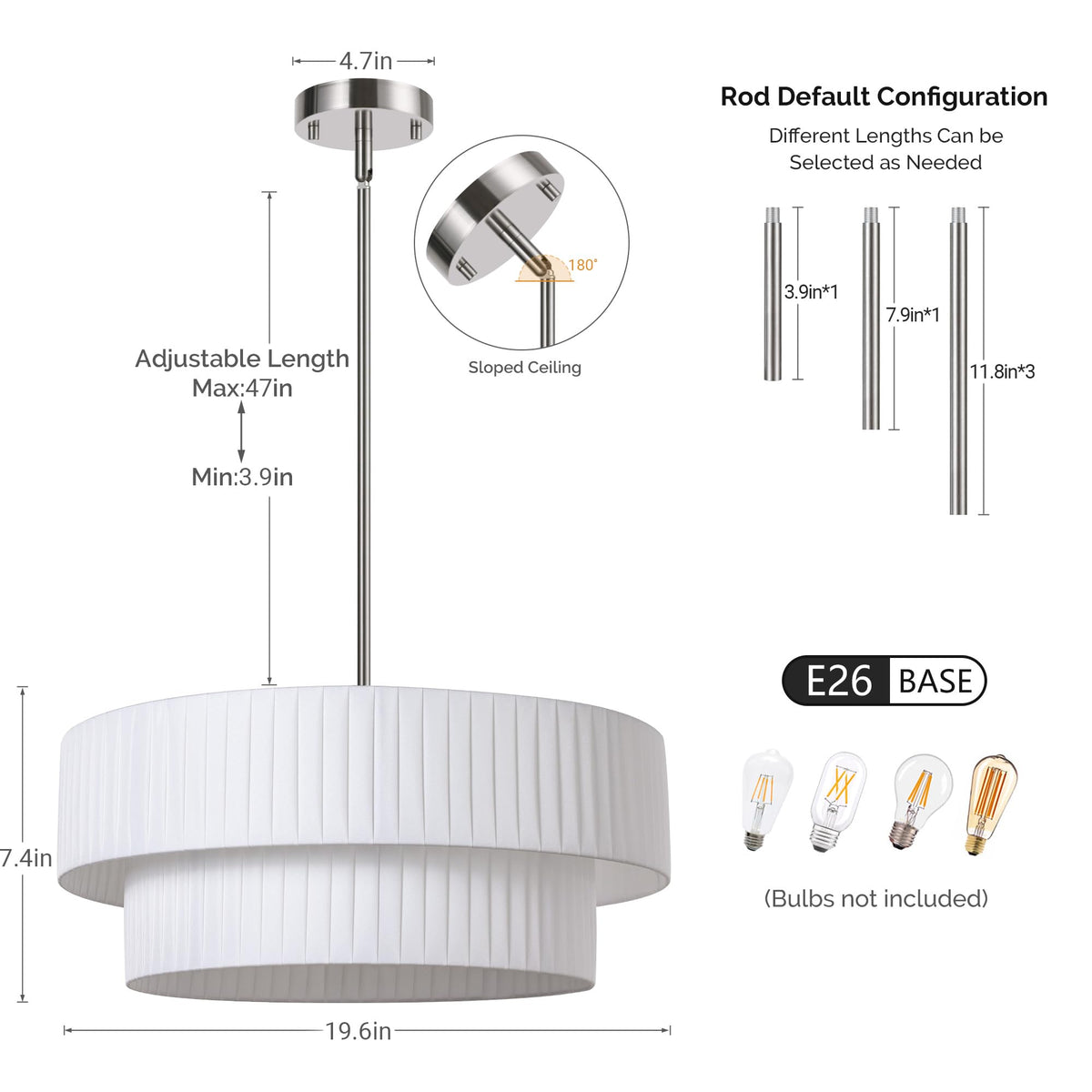 Introduction LamQee Modern Dual Layer Fabric Chandelier - a unique and stylish lighting choice for your indoor spaces. This semi flush mount light features a dual layer shade design, adding a touch of sophistication to any room. The lampshade of the drum chandelier is made of Huayao cloth, using natural linen yarn as the raw material, ensuring good breathability and comfort. The handwoven pleated texture adds an elegant appearance to the lampshade, while the soft fabric creates a warm and textured lighting effect. Combined with the glossy metal finish, it brings a stylish and elegant decorative appearance to any space. Specifications: Material: Iron Art+Fabric Voltage: 110 Color: Chrome + WhiteBase Type: E26*3 (60W max) (Bulbs Not Included) Shade Height: 7.5 inches Outer Shade Height: 4.5 inches Bulb Type: E26, 3 bulbs Mounting Plate Diameter: 4.7 inches Overall Diameter of the Light: 19.7 inches Light Pole Dimensions: 12 inches*3 + 6 inches*1 + 4 inches*1 (in total 5 poles) Application: Dining Rooms, Kitchen, Foyer, Entrance, Hallway Note of Maintenance Use a soft brush or a vacuum cleaner with a soft brush attachment to gently brush off surface dust and debris. Avoid using a hard-bristle brush or abrasive materials to prevent damage to the fabric fibers or any potential harm
