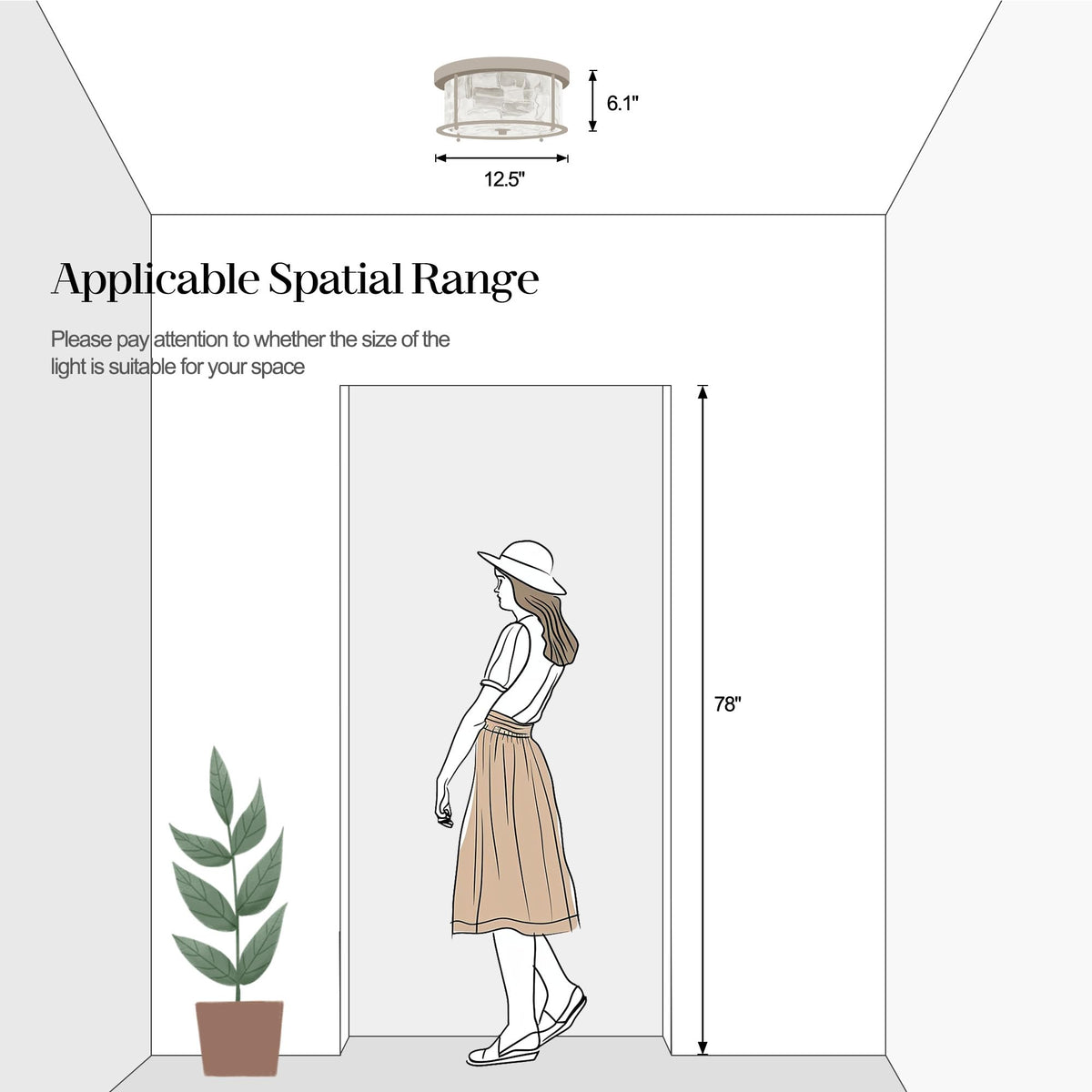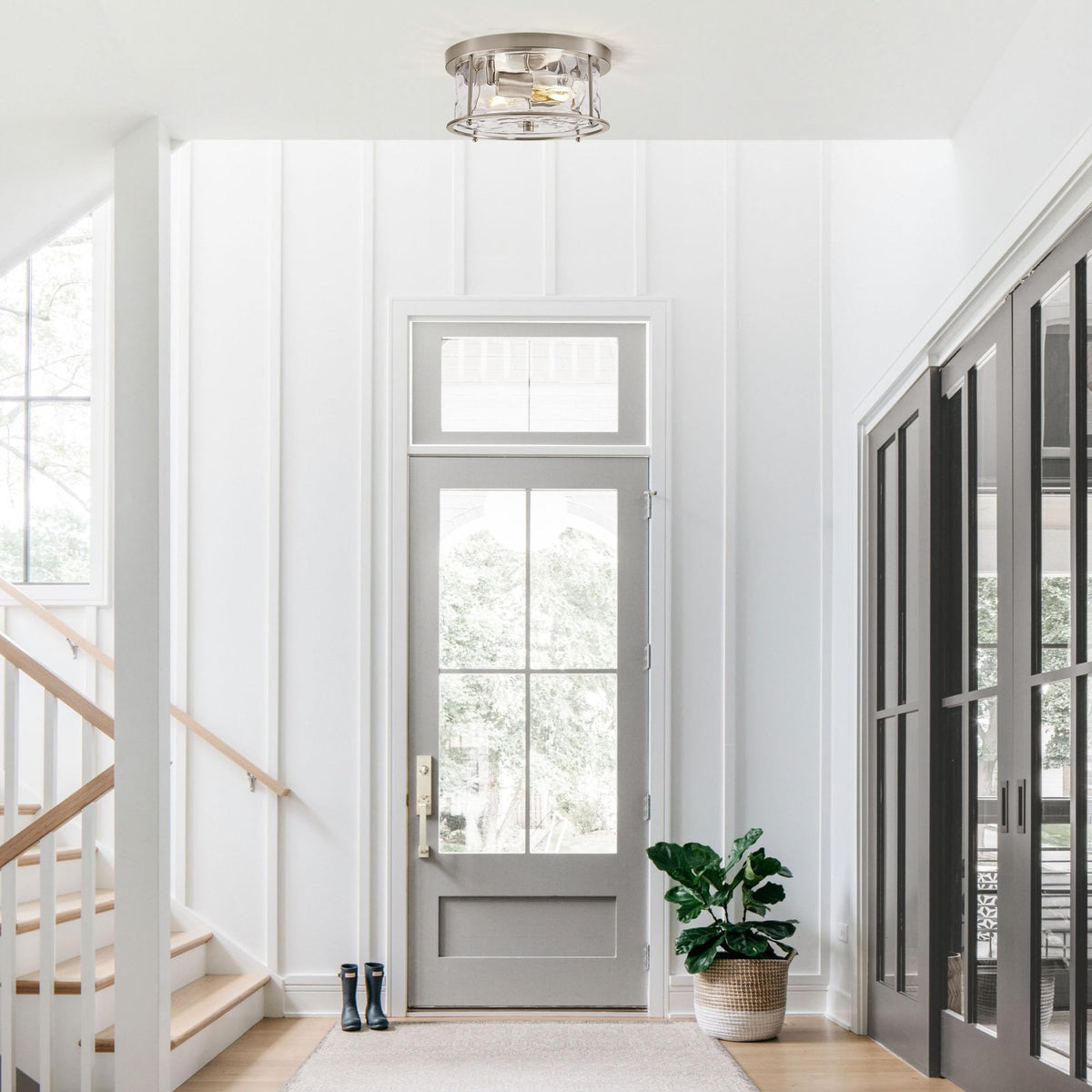 This flush mount ceiling light features a stunning hammered glass design encased in a durable metal frame, available in a stylish Brushed Nickel finish. The combination of materials not only adds an aesthetic appeal but also ensures longevity and stability. The unique design allows for bright illumination while minimizing the required headroom, making it suitable for various settings, including kitchens, dining areas, hallways, and bathrooms.