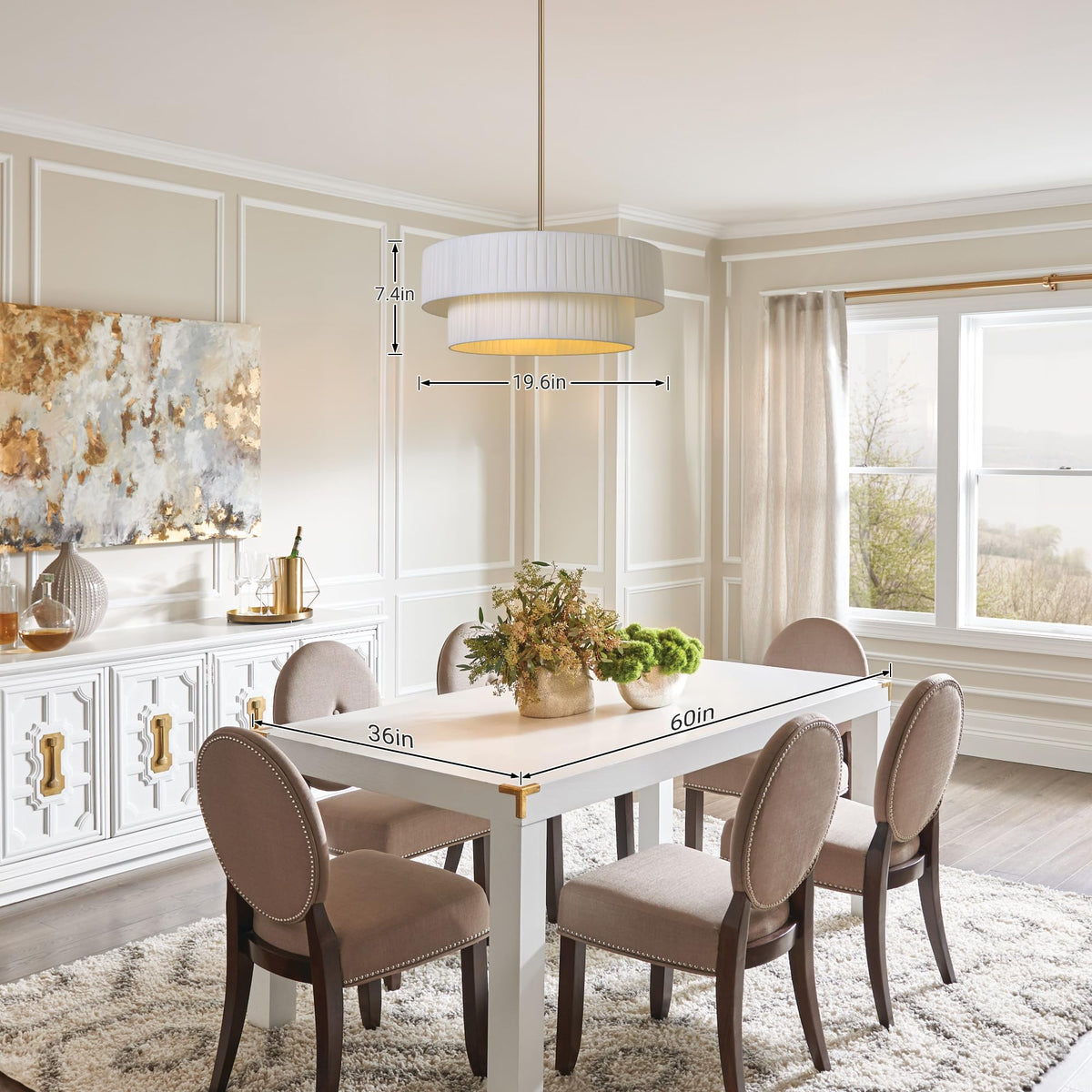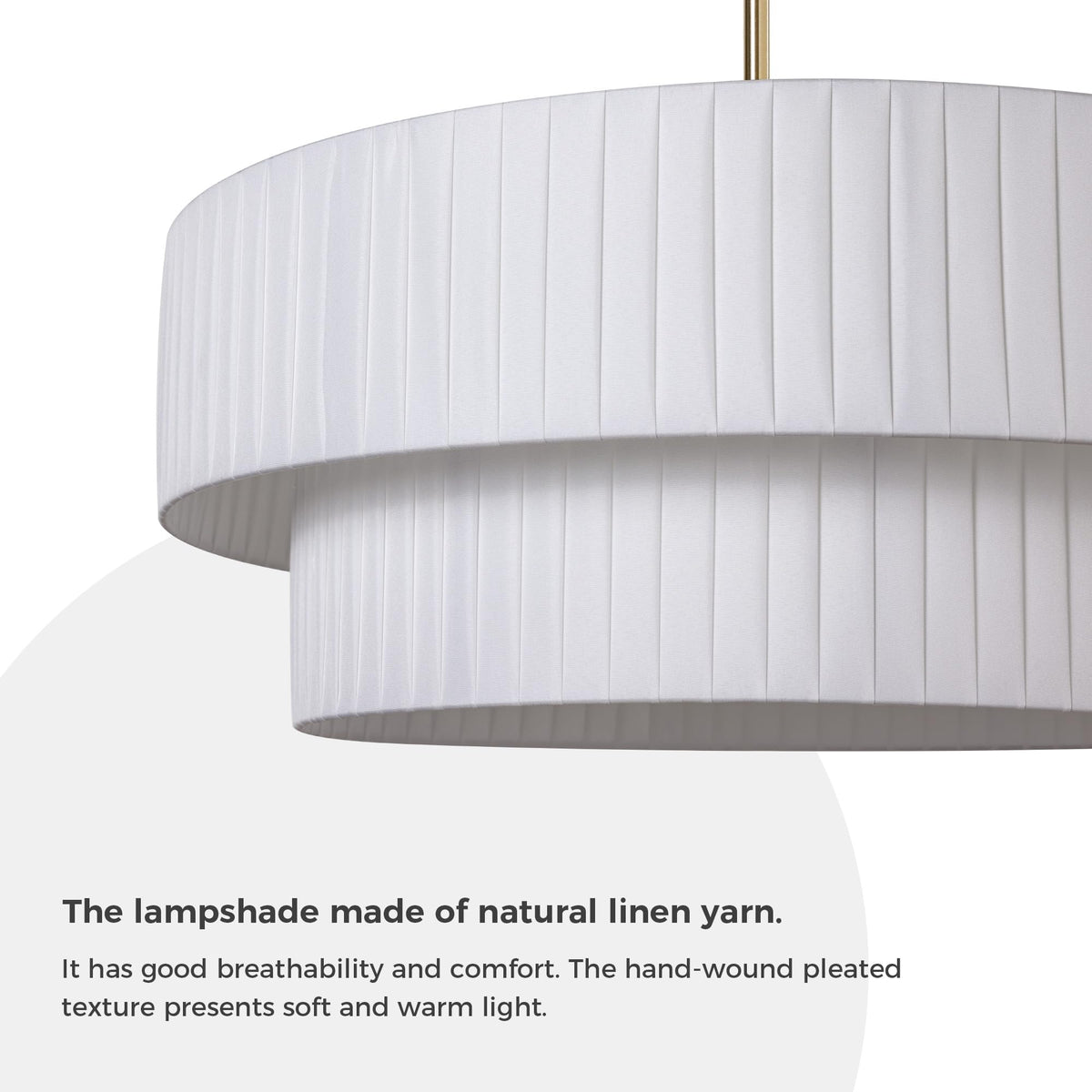 Introduction LamQee Modern Dual Layer Fabric Chandelier - a unique and stylish lighting choice for your indoor spaces. This semi flush mount light features a dual layer shade design, adding a touch of sophistication to any room. The lampshade of the drum chandelier is made of Huayao cloth, using natural linen yarn as the raw material, ensuring good breathability and comfort. The handwoven pleated texture adds an elegant appearance to the lampshade, while the soft fabric creates a warm and textured lighting effect. Combined with the glossy metal finish, it brings a stylish and elegant decorative appearance to any space. Specifications: Material: Iron Art+Fabric Voltage: 110V Color: Gold + White Fabric Base Type: E26*5 (60W max) (Bulbs Not Included) Shade Height: 9.2 inches Bulb Type: E26*bulbs x 5 Mounting Plate Diameter: 4.7 inches Overall Diameter of the Light: 23.6 inches Light Pole Dimensions: 11.8 inches*3 + 7.9inches*1 + 3.9 inches*1 (in total 5 poles) Application: Dining Rooms, Kitchen, Foyer, Entrance, Hallway,Island Note of Maintenance Use a soft brush or a vacuum cleaner with a soft brush attachment to gently brush off surface dust and debris. Avoid using a hard-bristle brush or abrasive materials to prevent damage to the fabric fibers or any potential harm