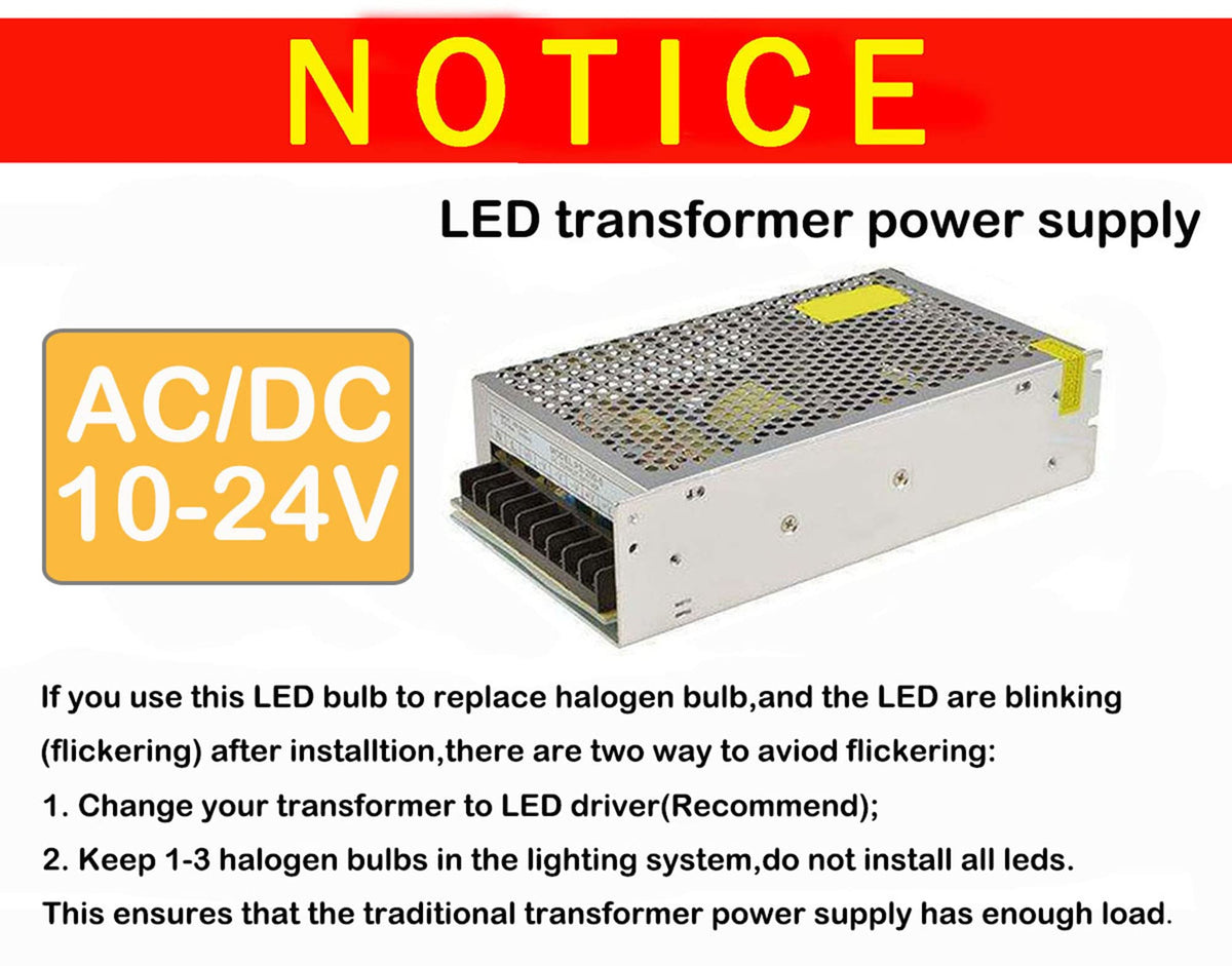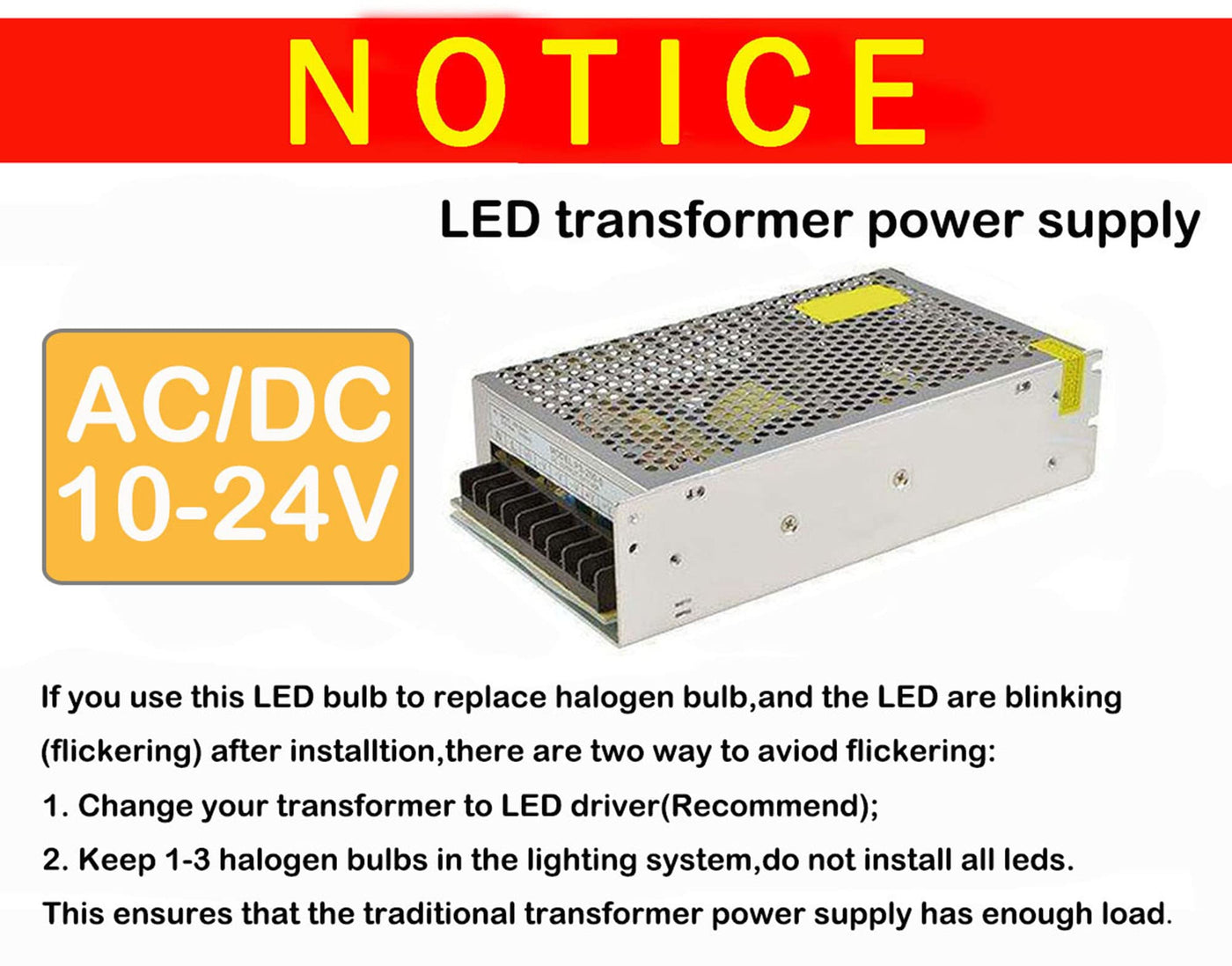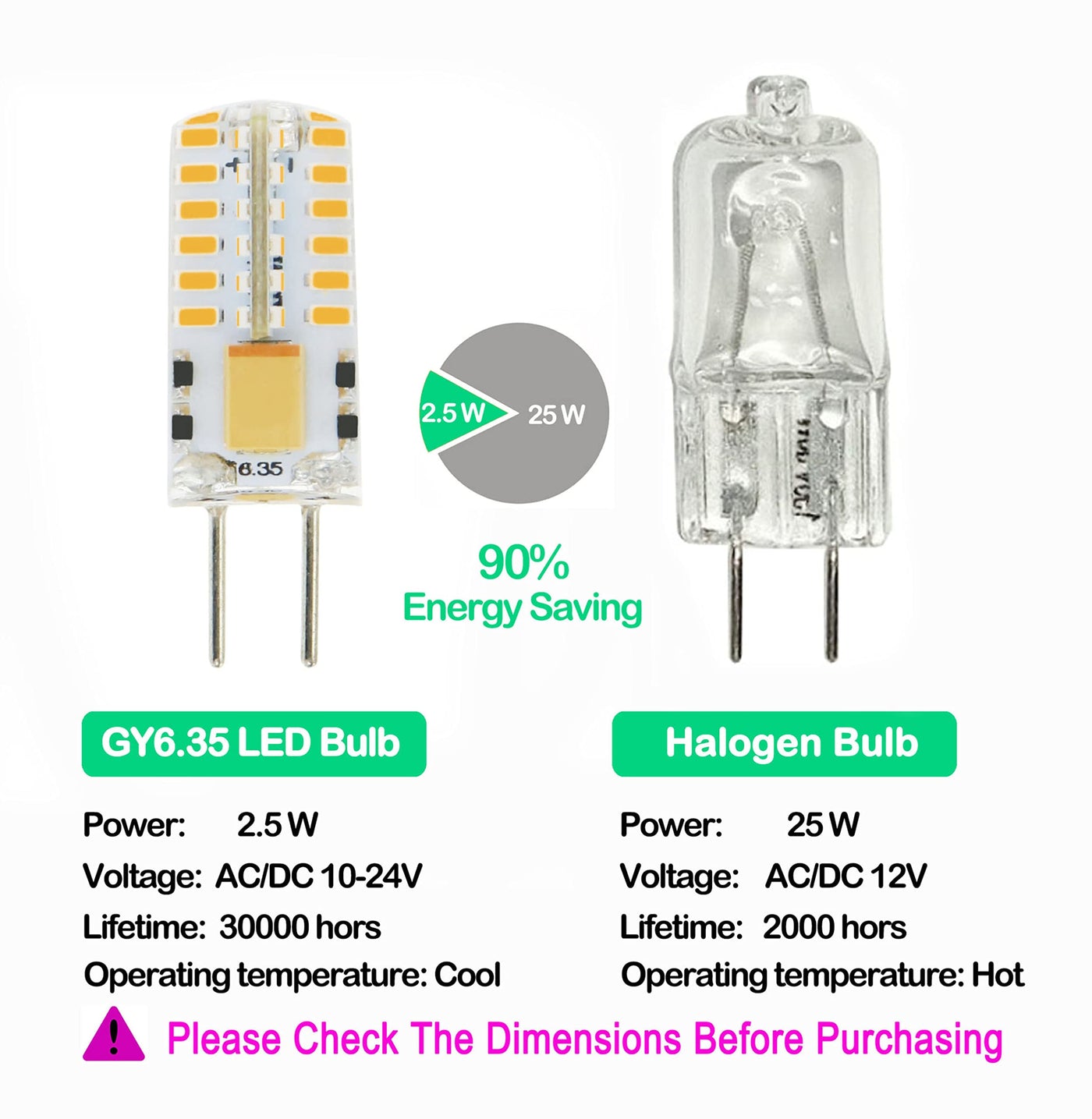 Safety Notice: Please note this is low voltage GY6.35 LED bulb.Make sure you are using a suitable transformer. 0.5 inches diameter,1.4 inches length,make sure the size fit your fixtures before purchase. Because the power of each LED is only 1/10 of the halogen bulb.If the LED bulb flashes,please check if you are using multiple transformers,and connect LED bulbs in series to try.