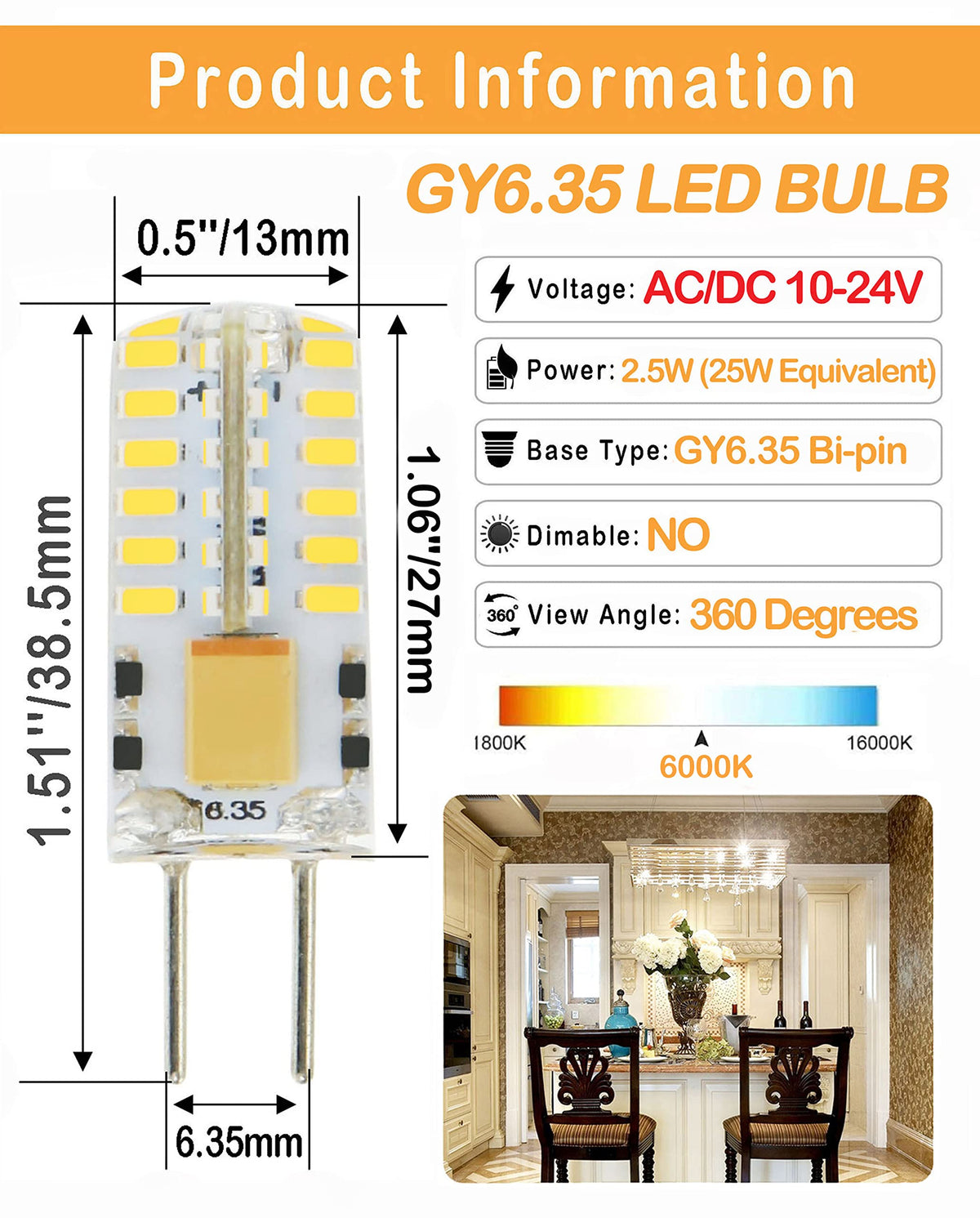 Unique Voltage Design We use higher design standards,compared with common GY6.35 bulbs only support 12V input voltage,the input voltage of Lamsky GY6.35 bulb is AC10-24V/DC10-30V,one of the best GY6.35 bulbs in the market.