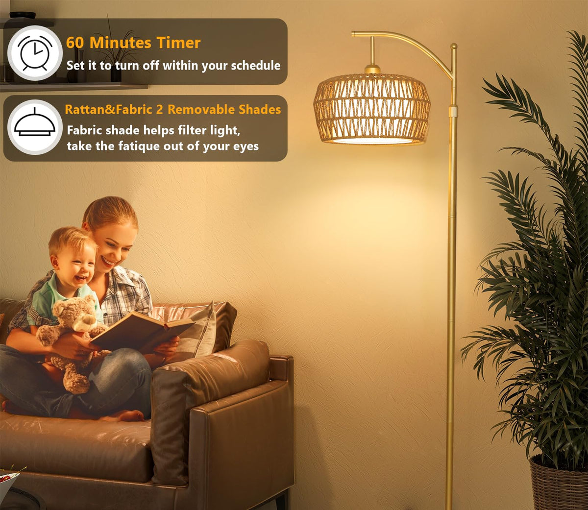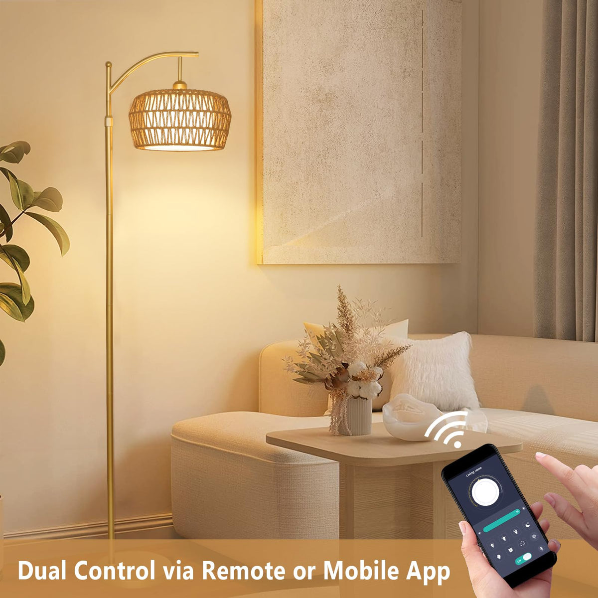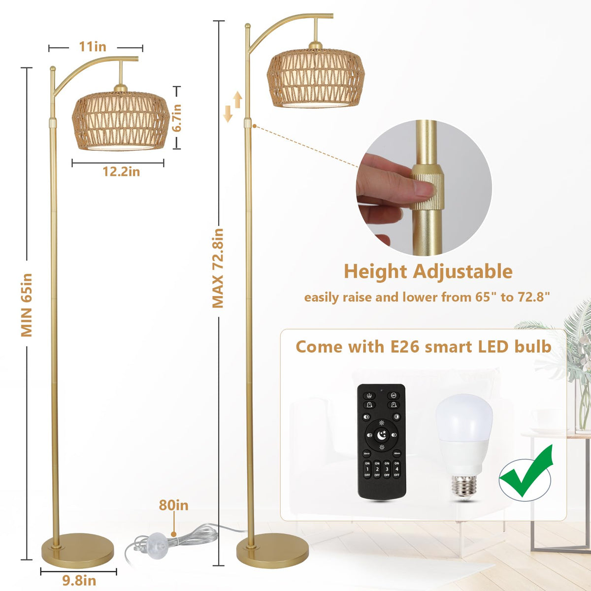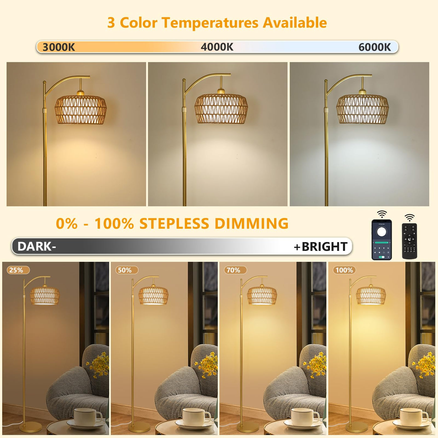 Lamsu Gold Floor Lamps For Living Room, Boho Rattan Floor Lamp With Remote And Dimmable Bulb, 3 Color Temperatures, Modern Arc S