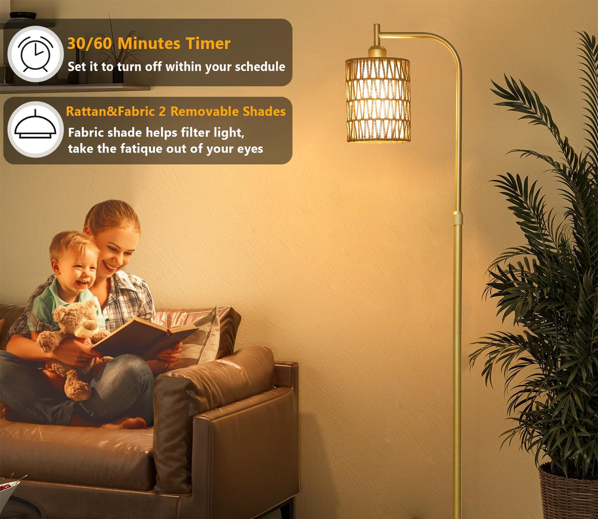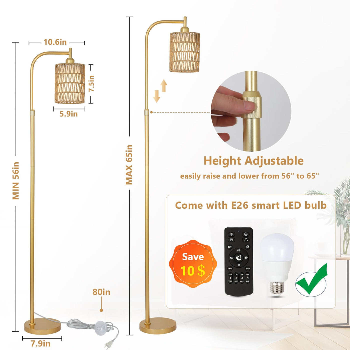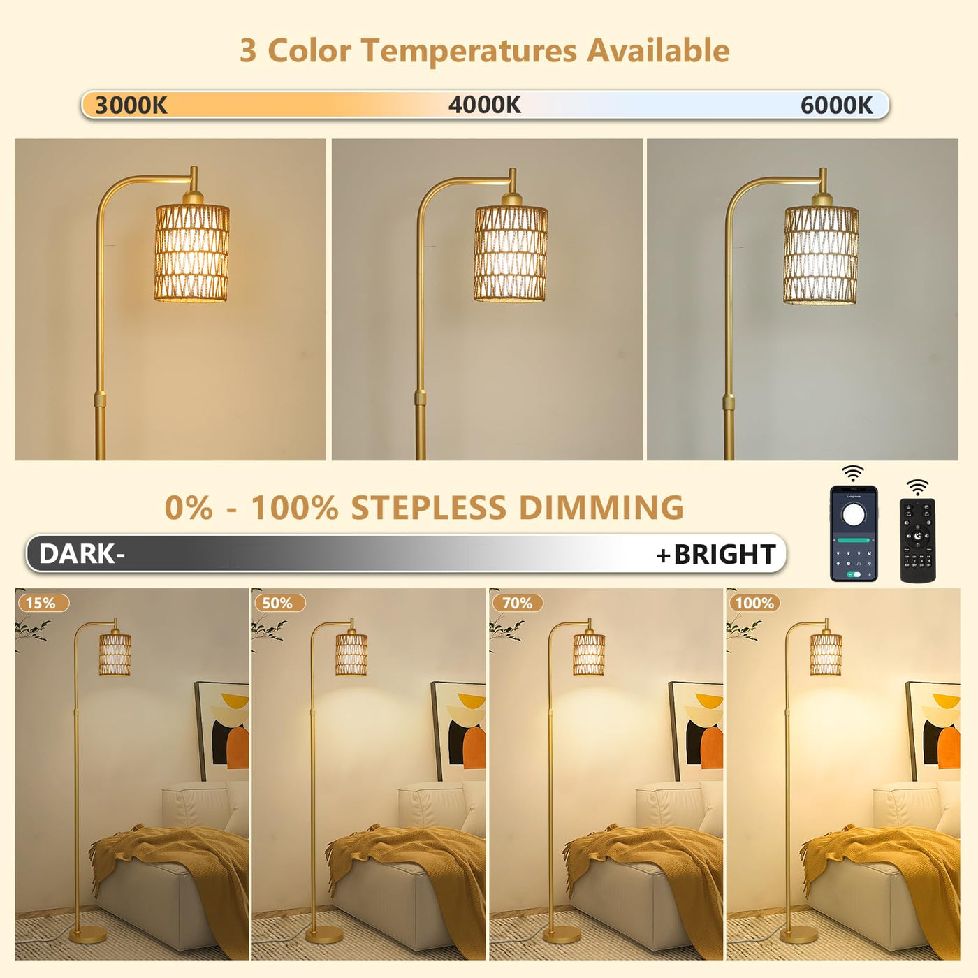 Lamsu Modern Gold Floor Lamps For Living Room, Boho Rattan Floor Lamp With Remote & Dimmable Led Bulb, Farmhouse Standing Lamp W