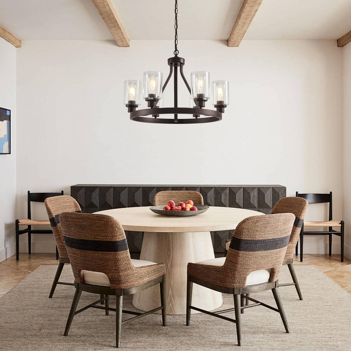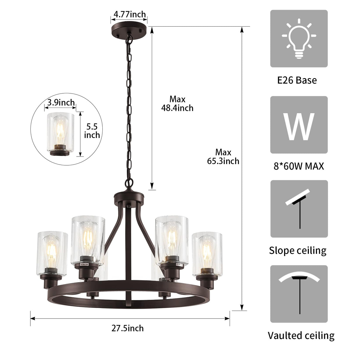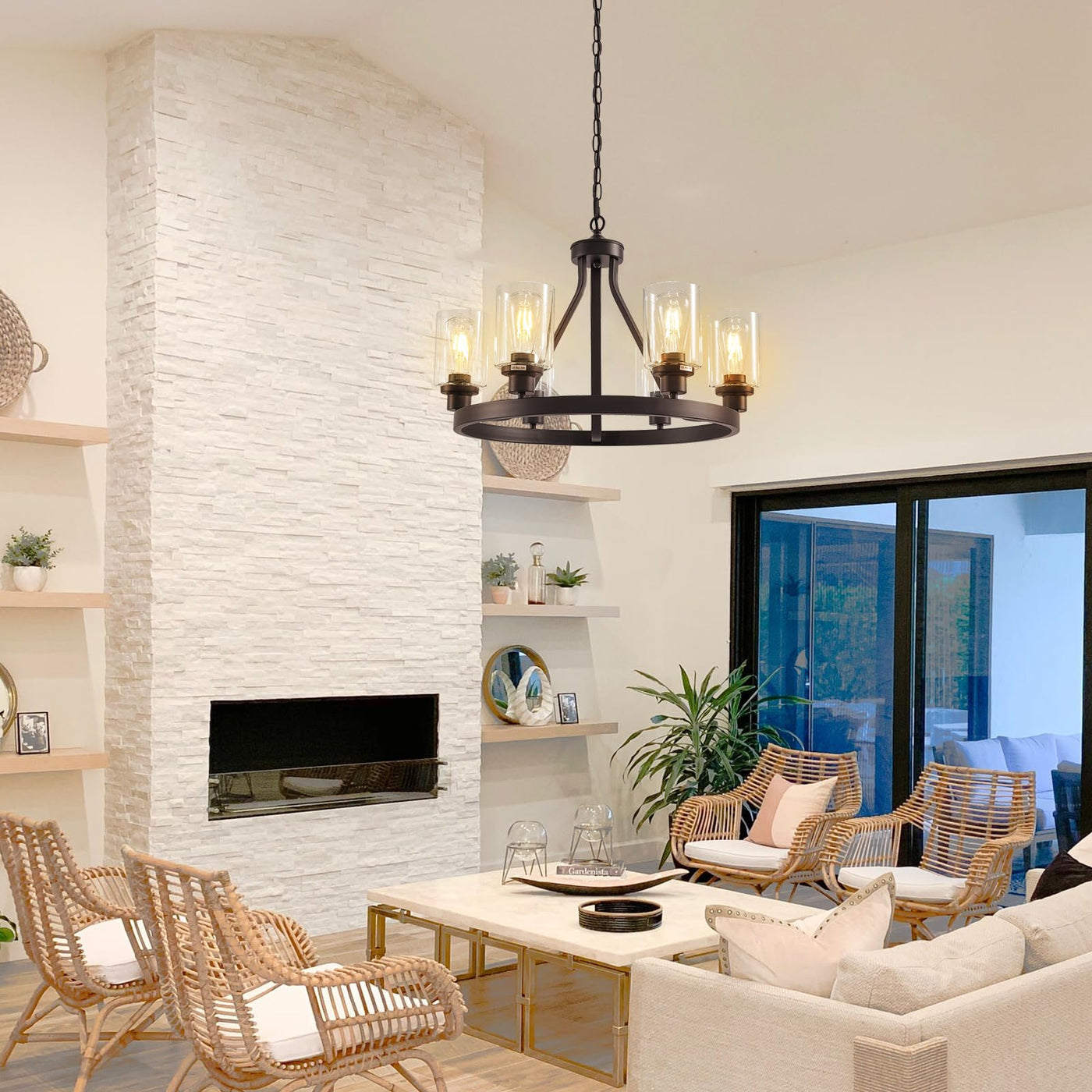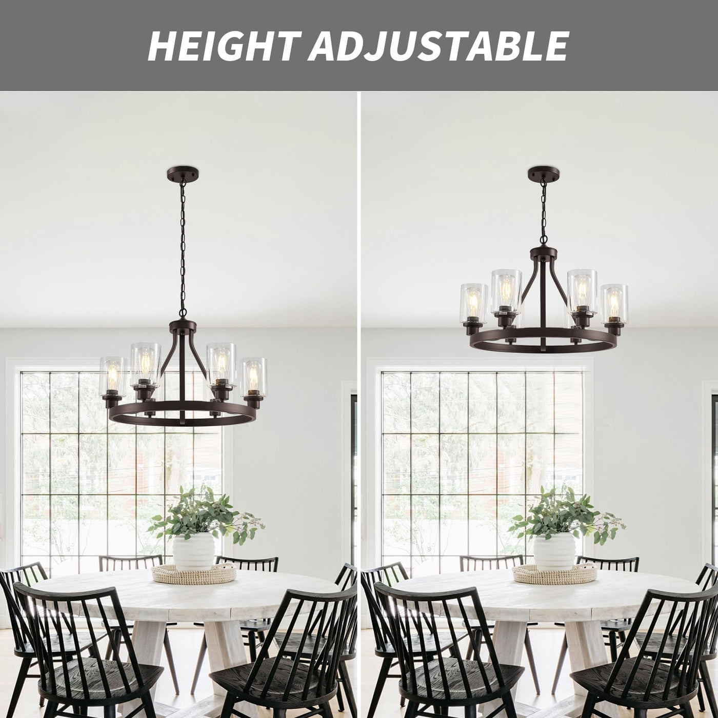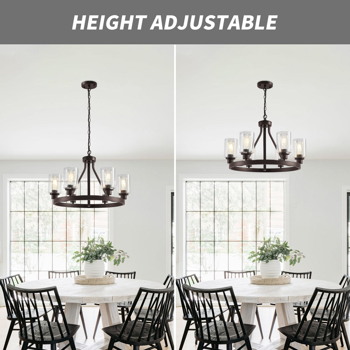 Rustic Farmhouse Design: The chandelier features a wagon wheel-inspired round frame with an oil-rubbed bronze finish and transparent glass shades, exuding a strong farmhouse country style that complements diverse decor themes.