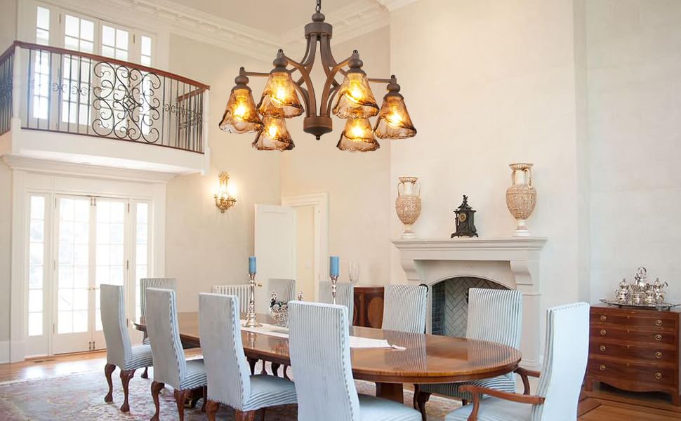 Lanpesting Vintage Farmhouse Chandelier 27 Inch Adjustable Amber Glass Rust-Finish Metal Pendant Light Fixture For Living Room Bedroom Dining Room Kitchen Lighting (6-Light)