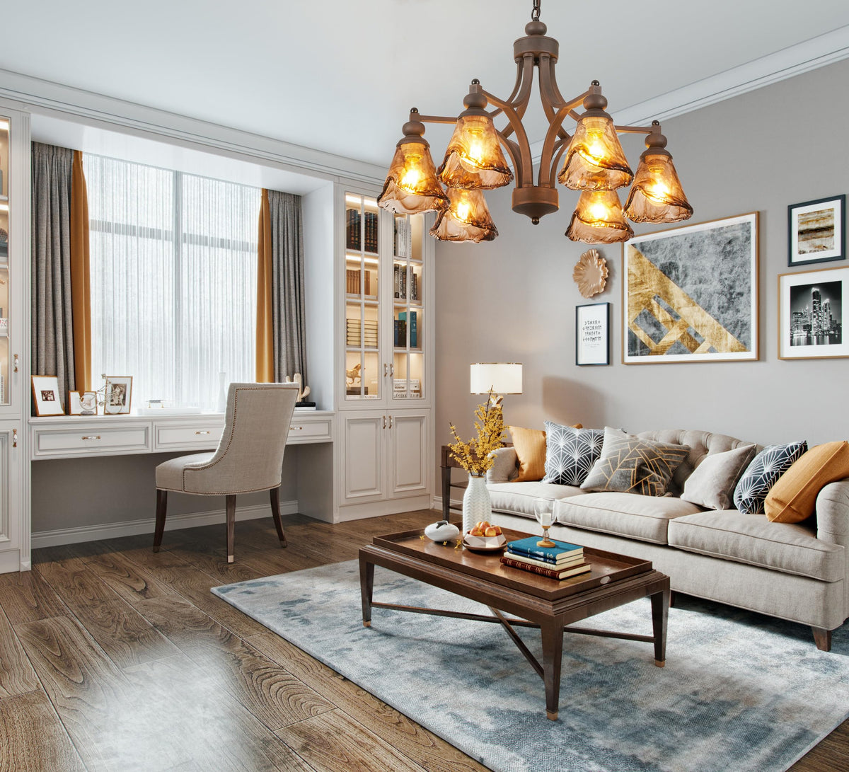 Transform Your Living Space With This Elegant 6-Light Chandelier Featuring Graceful Wrought Iron Arms In A Rich Bronze Finish. The Stunning Amber Glass Bell Shades Create A Warm Inviting Ambiance When Illuminated Casting Beautiful Patterns Of Light And Shadow. Each Shade Is Uniquely Crafted With A Delicate Bell Shape That Adds Vintage Charm To This Traditional Fixture. The ChandelierS Sophisticated Design Combines Sturdy Metal Construction With Decorative Curves And Flourishes Making It An Eye-Catching Centerpiece For Dining Rooms Entryways Or Living Areas. The Pendant-Style Mounting System With Chain Allows For Adjustable Hanging Height To Suit Your Space. The Combination Of Amber Glass And Dark Metalwork Creates A Timeless Aesthetic That Complements Both Classic And Transitional Interior Styles. This Light Fixture Serves As Both A Functional Lighting Solution And An Architectural Statement Piece That Will Enhance Your HomeS Decor For Years To Come.