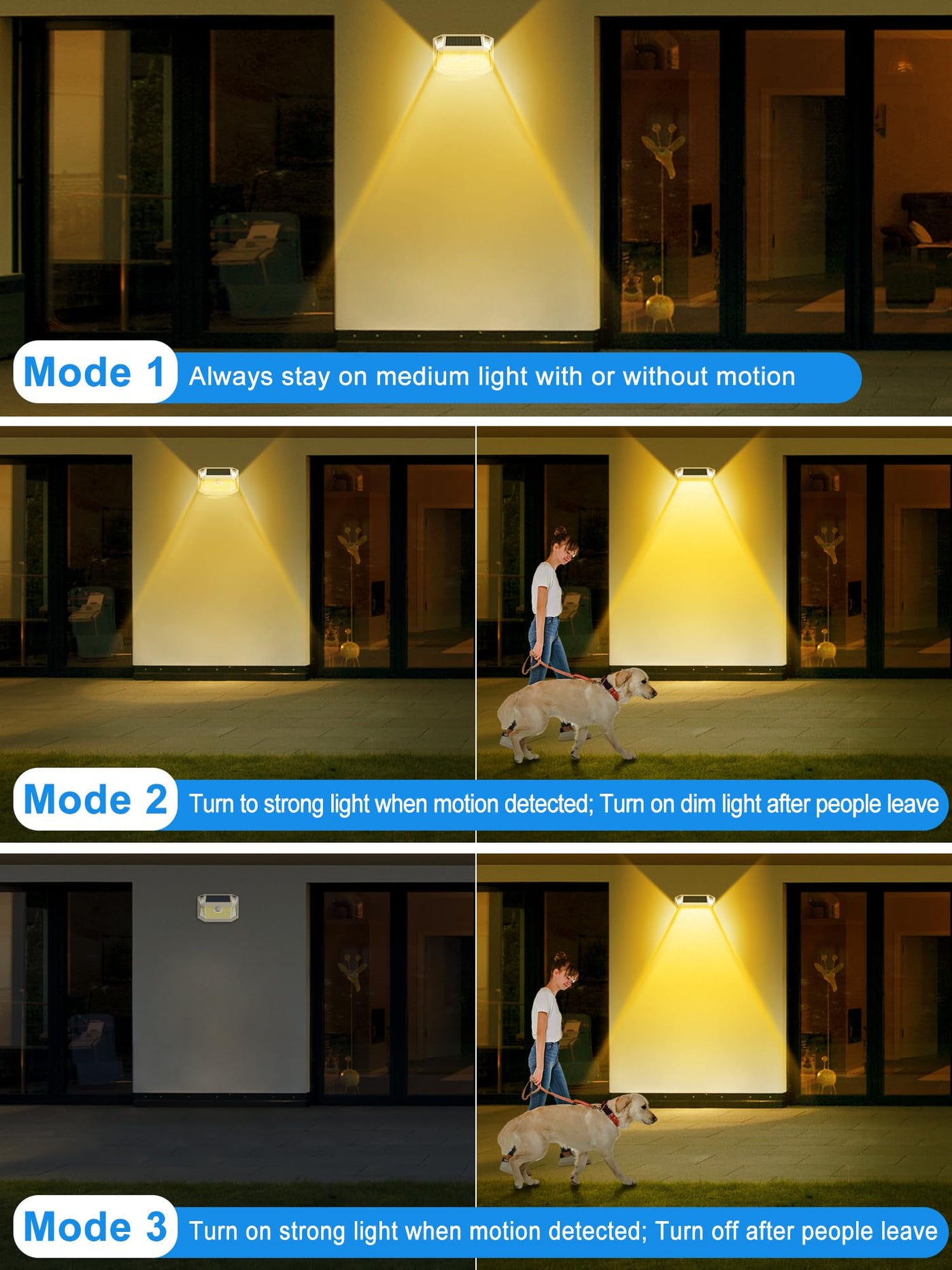 Q: What are the different lighting modes available for the LANSOW Solar Motion Lights?A: The LANSOW Solar Motion Lights offer three intelligent lighting modes: 1) Constant Medium Light Mode - stays on at medium brightness all night; 2) Dim Light Sensor Mode - remains dim and brightens when motion is detected; 3) Motion Sensor Mode - automatically turns on when motion is detected and turns off after 20-25 seconds without motion.
