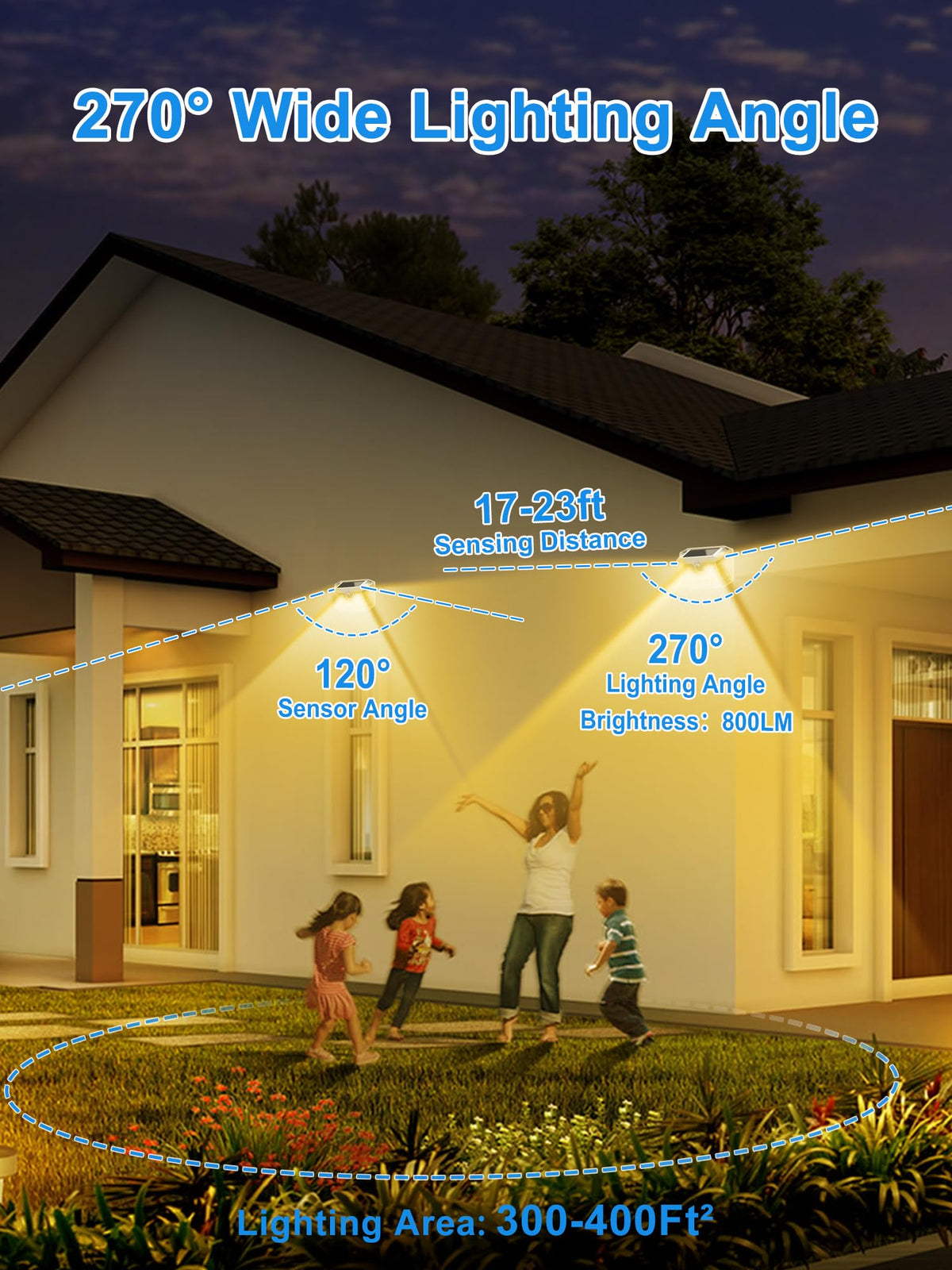Q: How far can the motion sensor detect movement?A: The motion sensor of the LANSOW Solar Motion Lights can detect movement within a distance of 3-5 meters (10-17 feet) and has a sensing angle of 120°, ensuring a wide coverage area for enhanced security.